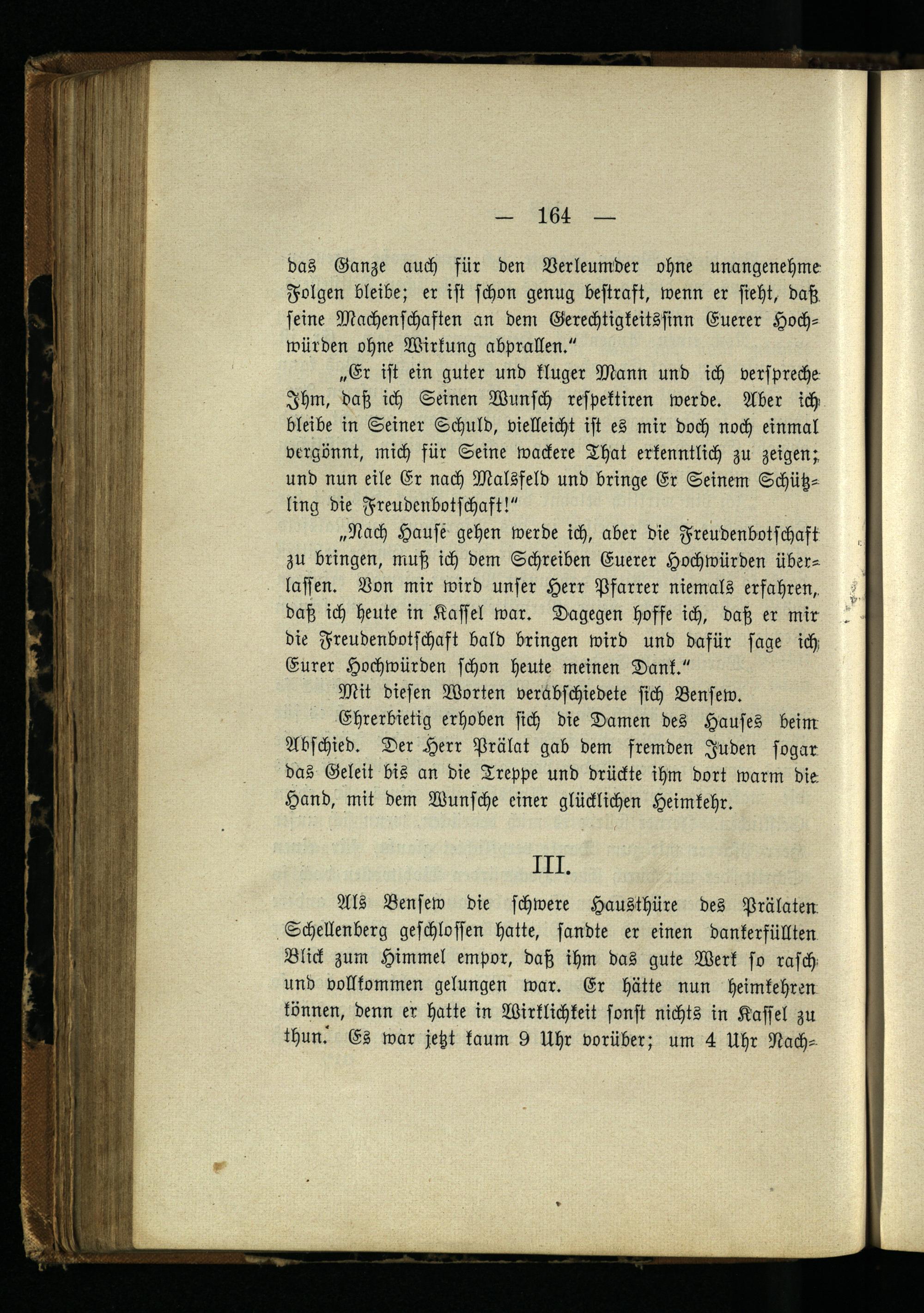 Als Bensew die schwere Hausthüre des Prälatew Schellenberg geschlossen hatte, sandte er einen dankerfüllten Blick zum Himmel empor, daß ihm das gute Werk so rasch und vollkommen gelungen war. Er hätte nun heimkehren können, denn er hatte in Wirklichkeit sonst nichts in Kassel zu thun.' Es war jetzt kaum 9 Uhr vorüber; um 4 Uhr Nach-