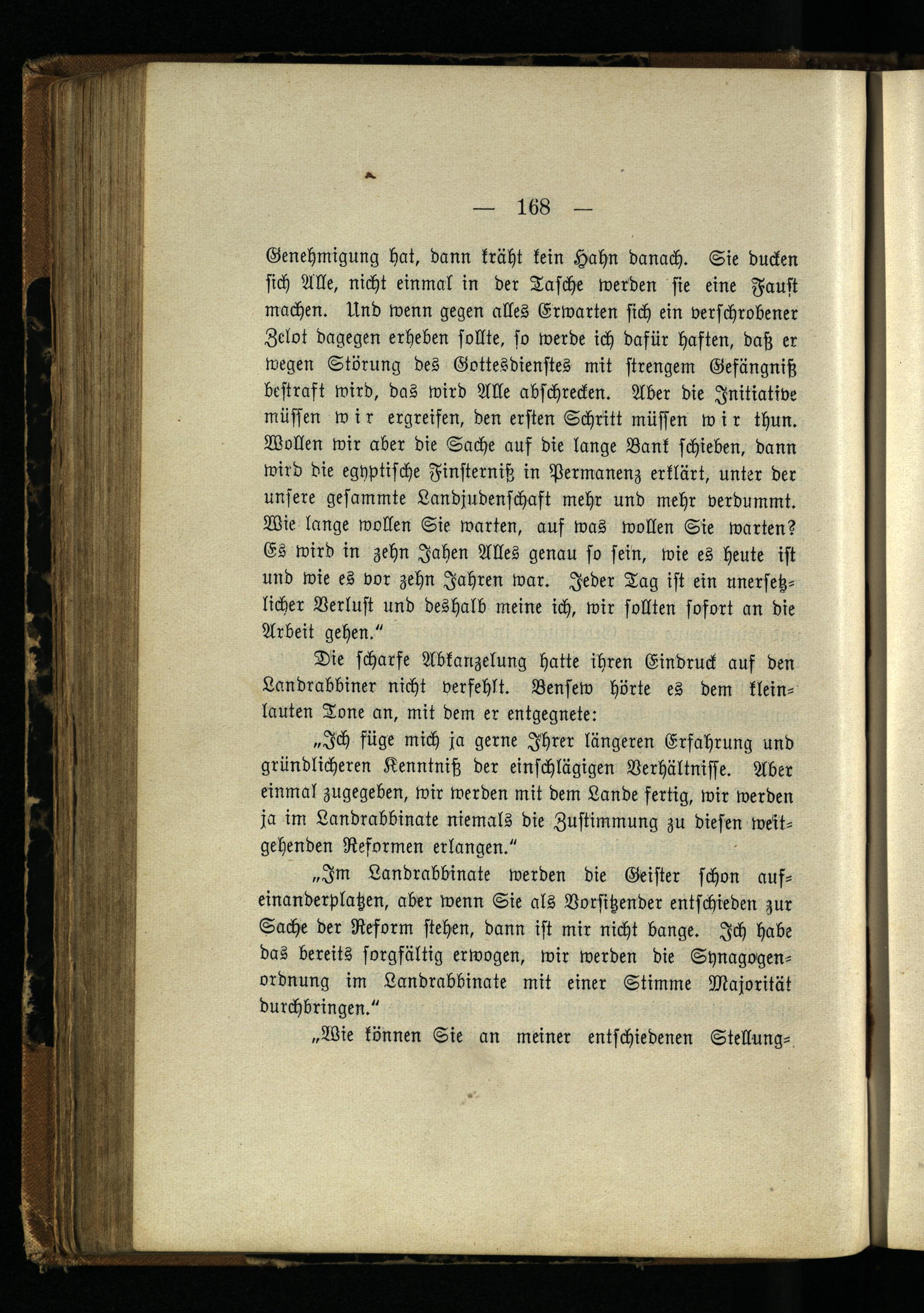 „Ich füge mich ja gerne Ihrer längeren Erfahrung und gründlicheren Kenntniß der einschlägigen Verhältnisse. Aber einmal zugegeben, wir werden mit dem Lande fertig, wir werden ja im Landrabbinate niemals die Zustimmung zu diesen weitgehenden Reformen erlangen."