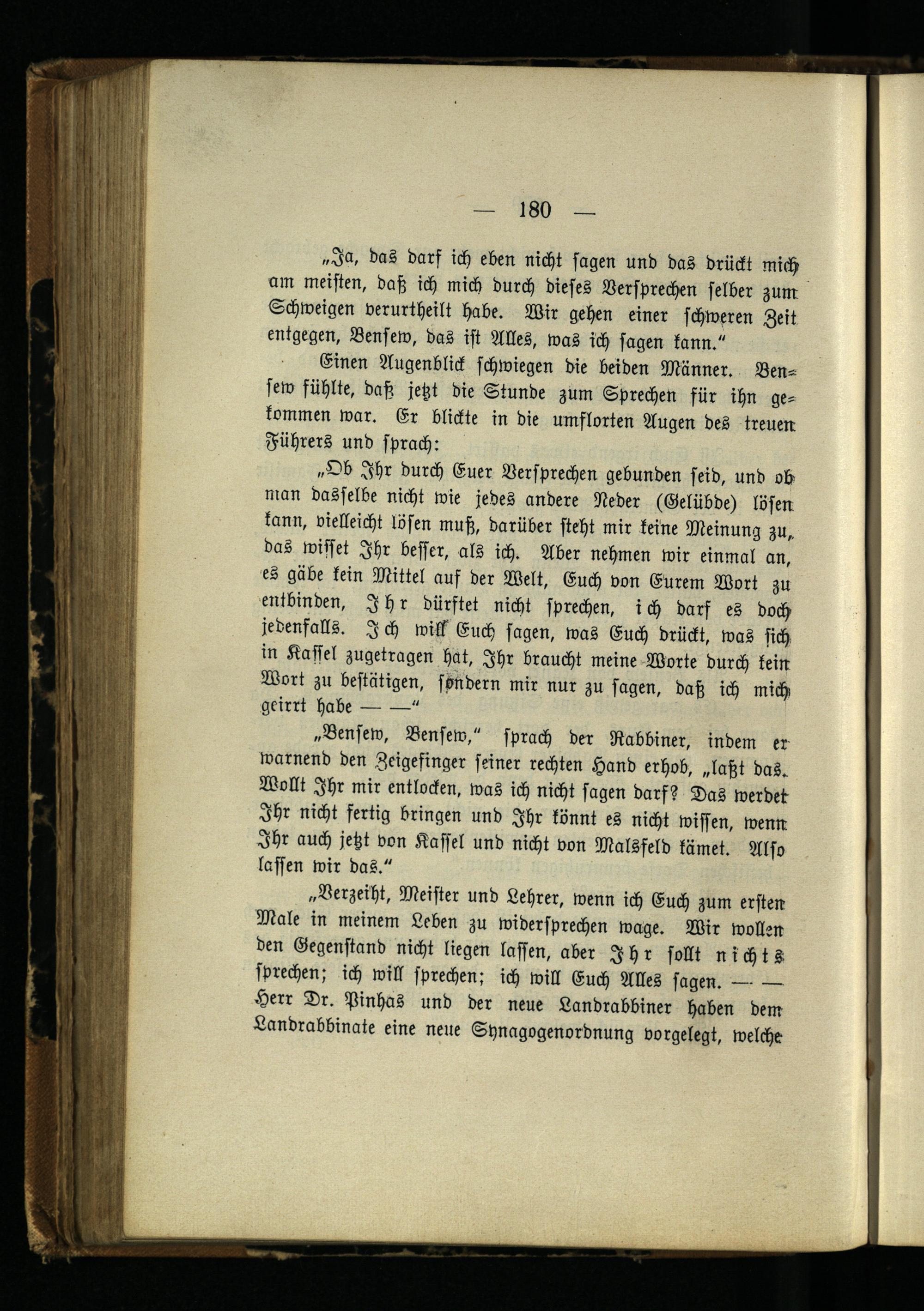 „Bensew, Bensew," sprach der Rabbiner, indem er warnend den Zeigefinger seiner rechten Hand erhob, „laßt das. Wollt Ihr mir entlocken, was ich nicht sagen darf? Das werdet Ihr nicht fertig bringen und Ihr könnt es nicht wissen, wenn Ihr auch jetzt von Kassel und nicht von Malsfeld kämet. Also lassen wir das."