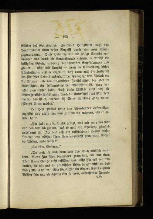 Glieder des Gottesvolkes. In dieses Heiligthum wagt das Landrabbinat einen rohen Eingriff durch seine neue Synagogenordnung. Diese Ordnung will die heilige Sprache verdrängen und durch die Landessprache ersetzen, sie streicht die heiligsten Gebete, sie verletzt die theuersten Empfindungen und glaubt — nicht mit Unrecht — wenn die Entweihung dieses Allerheiligsten erst gelungen ist, daß dann auch die Heiligkeit des jüdischen Lebens außerhalb der Synagoge dem Moloch der Aufklärung und des angeblichen Fortschrittes, der aber in Wirklichkeit ein beklagenswerther Rückschritt ist, ganz von selbst zum Opfer falle. Daß dieser Willkür nicht noch die landesherrliche Bestätigung durch die Unterschrift des Ministers werde, das ist es, worum ich Seine Excellenz ganz unter- thänigst bitten möchte."