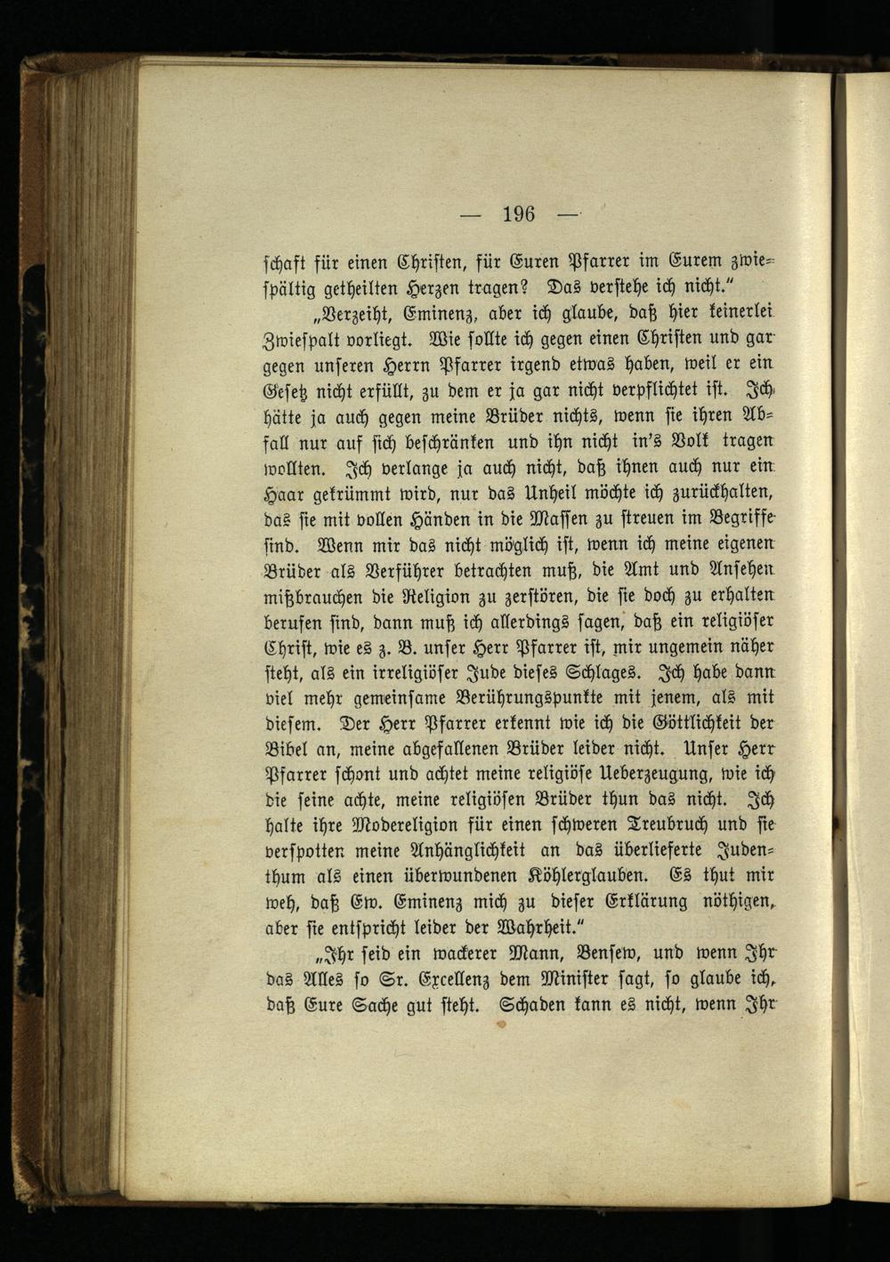 „Verzeiht, Eminenz, aber ich glaube, daß hier keinerlei Zwiespalt vorliegt. Wie sollte ich gegen einen Christen und gar gegen unseren Herrn Pfarrer irgend etwas haben, weil er ein Gesetz nicht erfüllt, zu dem er ja gar nicht verpflichtet ist. Ich. hätte ja auch gegen meine Brüder nichts, wenn sie ihren Abfall nur auf sich beschränken und ihn nicht in's Volk tragen wollten. Ich verlange ja auch nicht, daß ihnen auch nur eiw Haar gekrümmt wird, nur das Unheil möchte ich zurückhalten, das sie mit vollen Händen in die Masten zu streuen im Begriffe sind. Wenn mir das nicht möglich ist, wenn ich meine eigenen Brüder als Verführer betrachten muß, die Amt und Ansehen mißbrauchen die Religion zu zerstören, die sie doch zu erhalten berufen sind, dann muß ich allerdings sagen, daß ein religiöser Christ, wie es z. V. unser Herr Pfarrer ist, mir ungemein näher steht, als ein irreligiöser Jude dieses Schlages. Ich habe dann viel mehr gemeinsame Berührungspunkte mit jenem, als mit diesem. Der Herr Pfarrer erkennt wie ich die Göttlichkeit der Bibel an, meine abgefallenen Brüder leider nicht. Unser Herr Pfarrer schont und achtet meine religiöse Ueberzeugung, wie ich die seine achte, meine religiösen Brüder thun das nicht. Ich halte ihre Modereligion für einen schweren Treubruch und sie verspotten meine Anhänglichkeit an das überlieferte Judenthum als einen überwundenen Köhlerglauben. Es thut mir weh, daß Ew. Eminenz mich zu dieser Erklärung nöthigen, aber sie entspricht leider der Wahrheit."