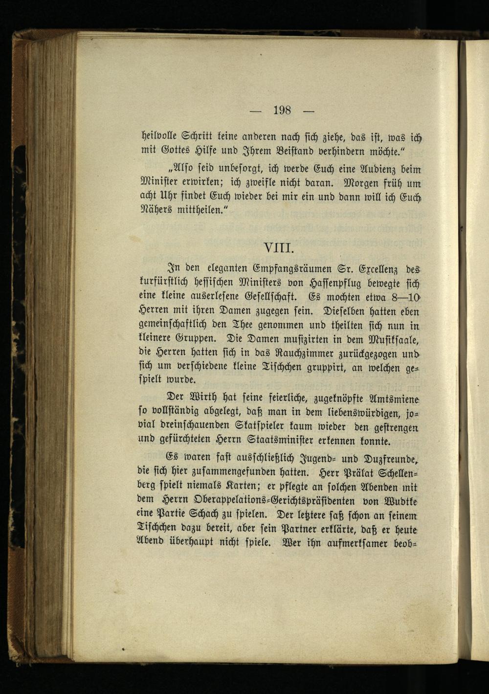 In den eleganten Empfangsräumen Sr. Excellenz des kurfürstlich hessischen Ministers von Hassenpslug bewegte sich eine kleine auserlesene Gesellschaft. Es mochten etwa 8—10 Herren mit ihren Damen zugegen sein. Dieselben hatten eben gemeinschaftlich den Thee genommen und theilten sich nun in kleinere Gruppen. Die Damen mufizirten in dem Müsiksaale, die Herren hatten sich in das Rauchzimmer zurückgezogen und sich um verschiedene kleine Tischchen gruppirt, an welchen gespielt wurde.