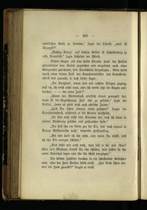 Die beiden Zuhörer brachen in ein schallendes Gelächter aus; aber der Herr Prälat blieb ernst. „Hat Euch schon einmal ein Jude geprellt?" fragte er ernst.