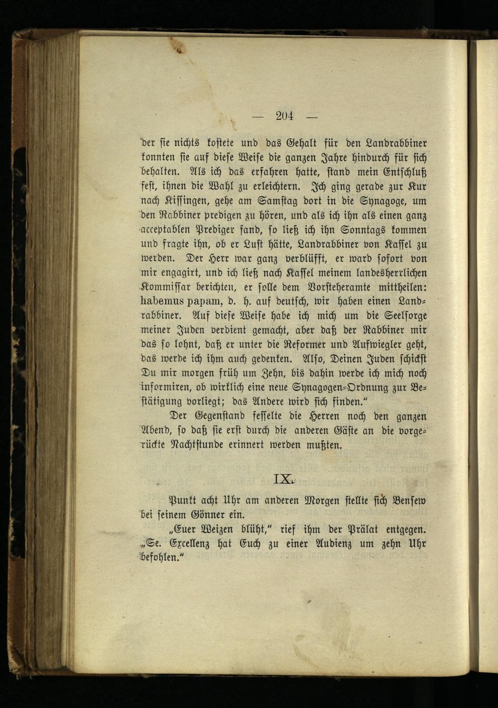 'der sie nichts kostete und das Gehalt für den Landrabbiner konnten sie aus diese Weise die ganzen Jahre hindurch für sich behalten. Als ich das erfahren hatte, stand mein Entschluß fest, ihnen die Wahl zu erleichtern. Ich ging gerade zur Kur nach Kissingen , gehe am Samstag dort in die Synagoge, um den Rabbiner predigen zu hören, und als ich ihn als einen ganz acceptablen Prediger fand, so ließ ich ihn Sonntags kommen und fragte ihn, ob er Lust hätte, Landrabbiner von Kassel zu werden. Der Herr war ganz verblüfft, er ward sofort von mir engagirt, und ich ließ nach Kassel meinem landesherrlichen Kommissar berichten, er solle dem Vorsteheramte mittheilen: üudtzinus xupÄin, d. h. auf deutsch , wir haben einen Landrabbiner. Auf diese Weise habe ich mich um die Seelsorge meiner Juden verdient gemacht, aber daß der Rabbiner mir das so lohnt, daß er unter die Reformer und Aufwiegler geht, das werde ich ihm auch gedenken. Also, Deinen Juden schickst Du mir morgen früh um Zehn, bis dahin werde ich mich noch informiren, ob wirklich eine neue Synagogen-Ordnung zur Bestätigung vorliegt; das Andere wird sich finden."