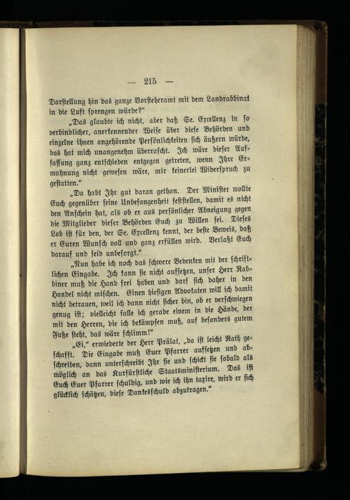 „Ei," erwiederte der Herr Prälat, „da ist leicht Rath geschafft. Die Eingabe muß Euer Pfarrer aufsetzen und abschreiben, dann unterschreibt Ihr sie und schickt sie sobald als möglich an das Kurfürstliche Staatsministerium. Das ist Euch Euer Pfarrer schuldig, und wie ich ihn taxire, wird er sich glücklich schätzen, diese Dankesschuld abzutragen."