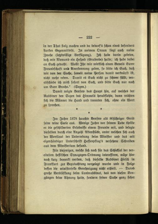 in der That stolz machen und da bedarf's schon eines besonders starken Gegenmittels. In meinem Oraun liegt auch meine Zwohe (letztwilligp Verfügung). Ich habe darin gebeten, daß mir Niemand ein Hesped (Grabrede) halte; ich habe dabei an Euch gedacht. Wollt Ihr mir wirklich einen Beweis Eurer Freundschaft und Anerkennung geben, so bitte ich Euch, daß wir von der Sache, soweit meine Person damit verknüpft ist, nicht mehr reden. Damit es Euch nicht zu schwer fällt, verabschiede ich mich sofort von Euch, und bitte Euch nur noch um Eure Brocho." (Segen.)