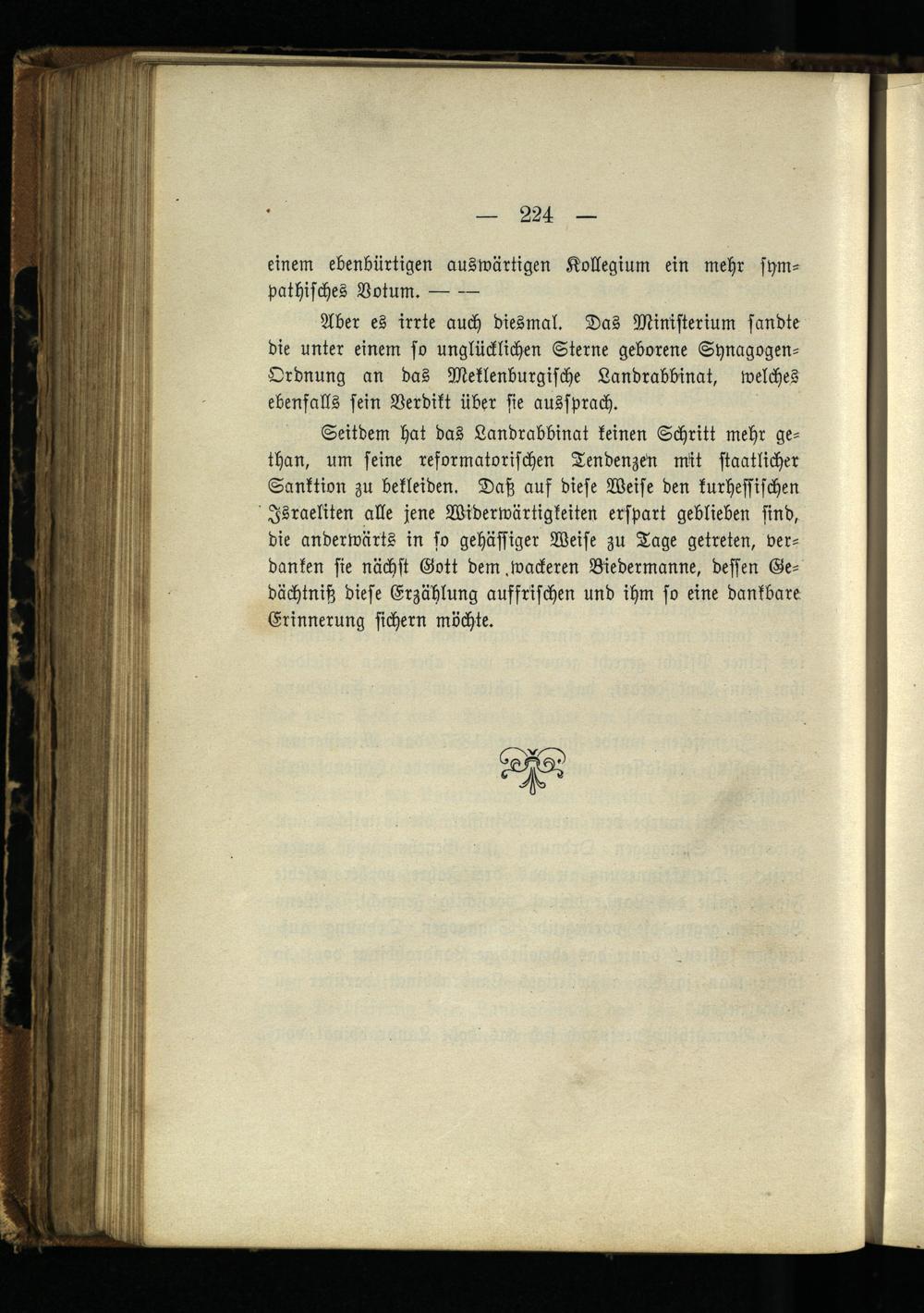 Aber es irrte auch diesmal. Das Ministerium sandte die unter einem so unglücklichen Sterne geborene Synagogen- Ordnung an das Meklenburgische Landrabbinat, welches ebenfalls sein Verdikt über sie aussprach.