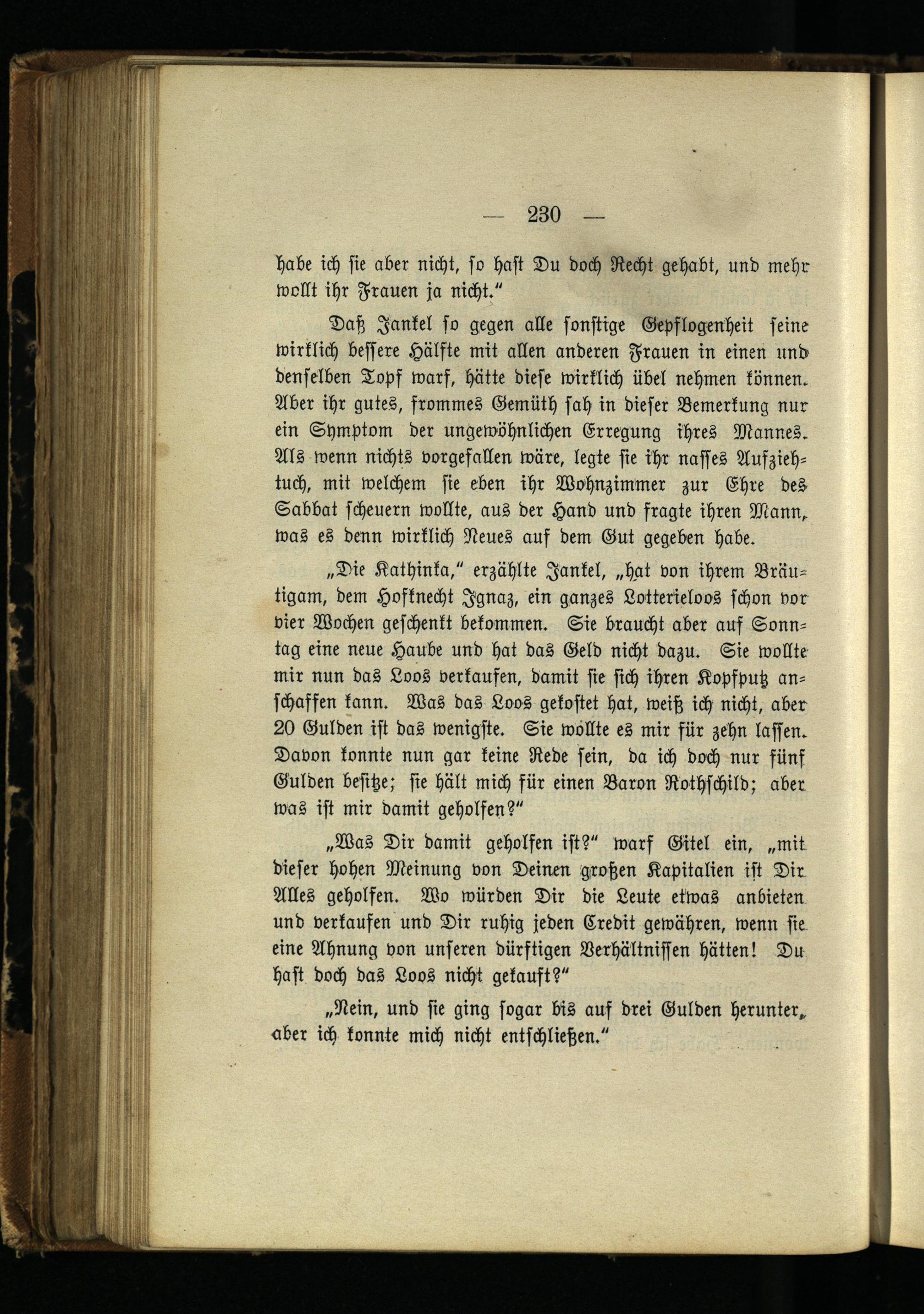 „Was Dir damit geholfen ist?" warf Gitel ein, „mit dieser hohen Meinung von Deinen großen Kapitalien ist Dir Alles geholfen. Wo würden Dir die Leute etwas anbieten und verkaufen und Dir ruhig jeden Credit gewähren, wenn sie eine Ahnung von unseren dürftigen Verhältnissen hätten! Du hast doch das Loos nicht gekauft?"