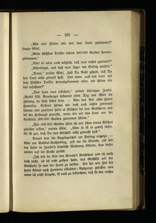 „Das kann man erfahren," meinte überlegen Jankel. „Rabbi Löb Bamberger bekommt jeden Tag von Wien die Zeitung, da steht Alles drin. — Aber das sind alles Hewel Hawolim. Erstens hätten wir doch auch nichts gewinnen können und zweitens hätte es Rischus bei dem Gutsherrn und bei der Hofmagd gemacht, wenn wir mit dem Loos von der Kathinka 300 000 Gulden gewonnen hätten."