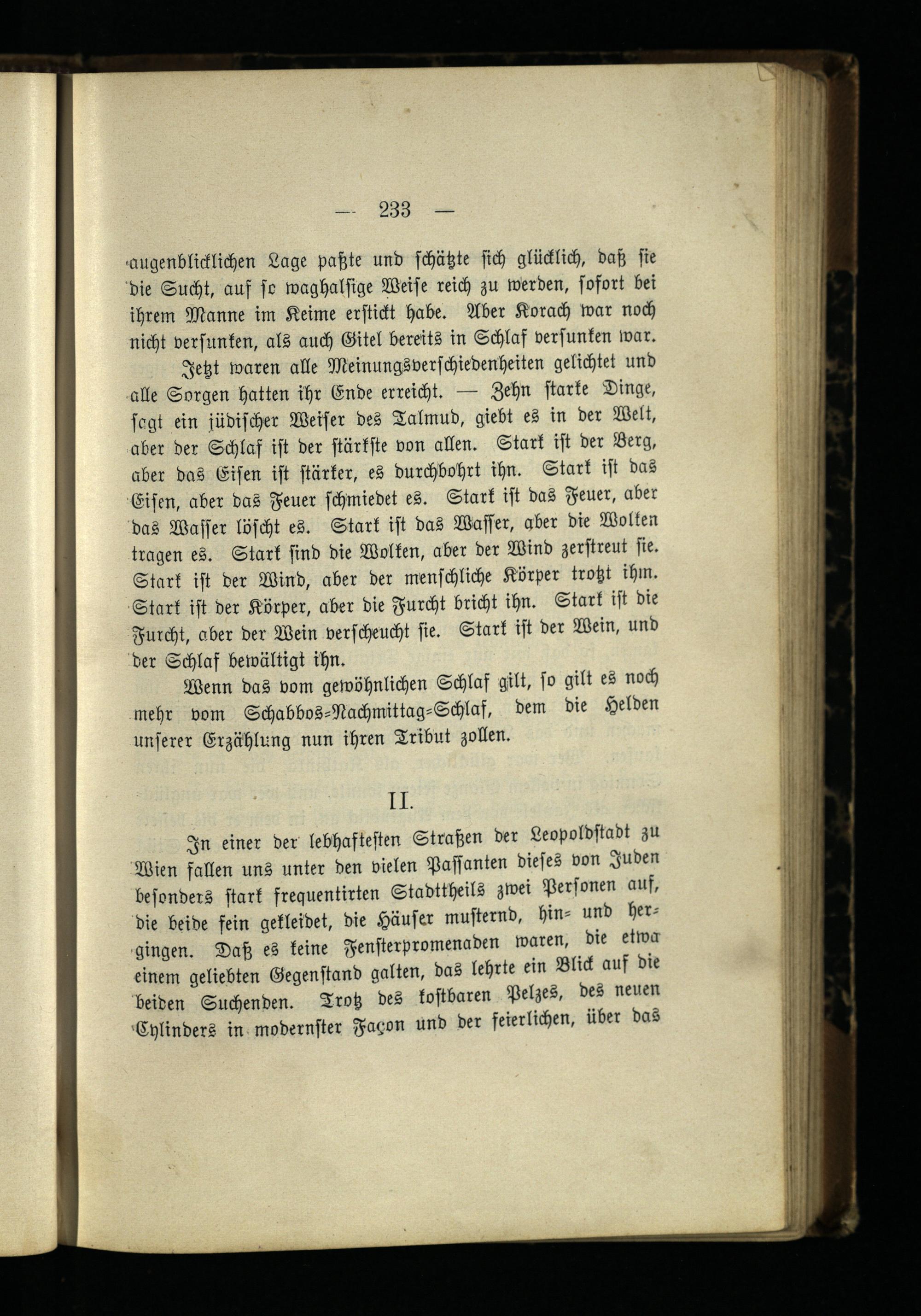 Jetzt waren alle Meinungsverschiedenheiten gelichtet und alle Sorgen hatten ihr Ende erreicht. — Zehn starke Dinge, sagt ein jüdischer Weiser des Talmud, giebt es in der Welt, aber der Schlaf ist der stärkste von allen. Stark ist der Berg, aber das Eisen ist stärker, es durchbohrt ihn. Stark ist das Eisen, aber das Feuer schmiedet es. Stark ist das Feuer, aber das Wasser löscht es. Stark ist das Wasser, aber die Wolken tragen es. Stark sind die Wolken, aber der Wind zerstreut sie. Stark ist der Wind, aber der menschliche Körper trotzt ihin. Stark ist der Körper, aber die Furcht bricht ihn. Stark ist die Furcht, aber der Wein verscheucht sie. Stark ist der Wein, und der Schlaf bewältigt ihn.