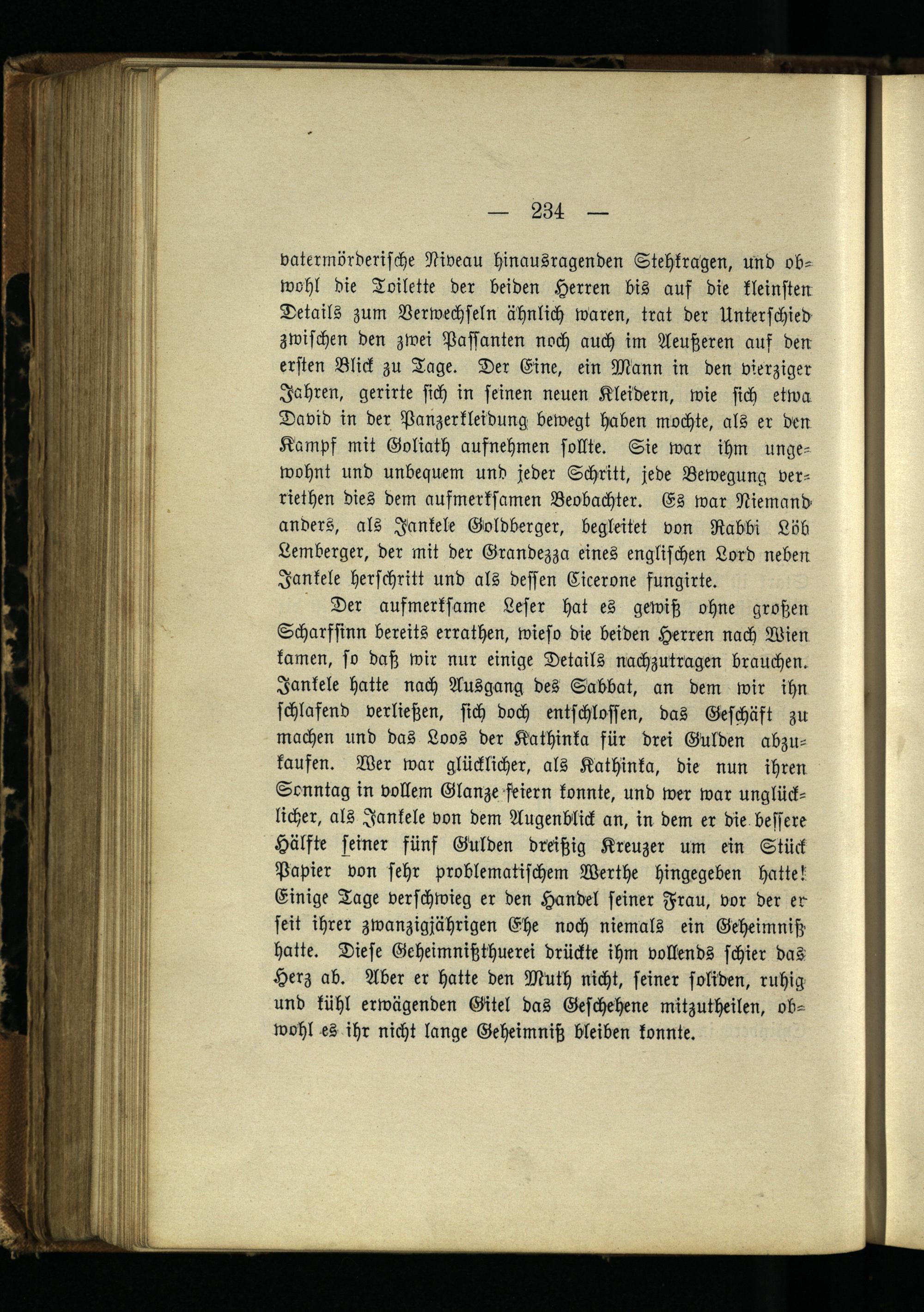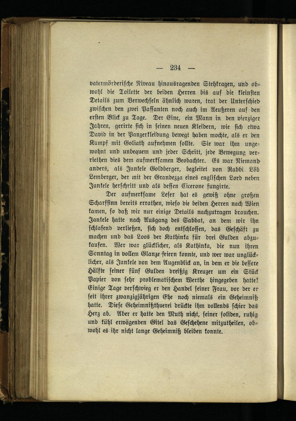 Der aufmerksame Leser hat es gewiß ohne großen Scharfsinn bereits errathen, wieso die beiden Herren nach Wien kamen, so daß wir nur einige Details nachzutragen brauchen. Jankele hatte nach Ausgang des Sabbat, an dem wir ihn schlafend verließen, sich doch entschlossen, das Geschäft zu machen und das Loos der Kathinka für drei Gülden abzukaufen. Wer war glücklicher, als Kathinka, die nun ihren Sonntag in vollem Glanze feiern konnte, und wer war unglücklicher, als Jankele von dem Augenblick an, in dem er die bessere Hälfte seiner fünf Gülden dreißig Kreuzer um ein Stück Papier von sehr problematischem Werthe hingegeben hattet Einige Tage verschwieg er den Handel seiner Frau, vor der er seit ihrer zwanzigjährigen Ehe noch niemals ein Geheimniß hatte. Diese Geheimnißthuerei drückte ihm vollends schier das Herz ab. Aber er hatte den Müth nicht, seiner soliden, ruhig und kühl erwägenden Gitel das Geschehene mitzutheilen, obwohl es ihr nicht lange Geheimniß bleiben konnte.