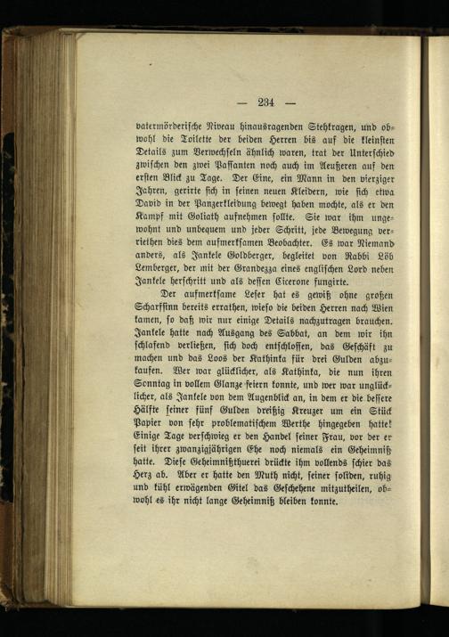 vatermörderische Niveau hinausragenden Stehkragen, und obwohl die Toilette der beiden Herren bis auf die kleinsten Details zum Verwechseln ähnlich waren, trat der Unterschied zwischen den zwei Passanten noch auch im Aeußeren auf den ersten Blick zu Tage. Der Eine, ein Mann in den vierziger Jahren, gerirte sich in seinen neuen Kleidern, wie sich etwa David in der Panzerkleidung bewegt haben mochte, als er den Kampf mit Goliath aufnehmen sollte. Sie war ihm ungewohnt und unbequem und jeder Schritt, jede Bewegung ver- riethen dies dem aufmerksamen Beobachter. Es war Niemand anders, als Jankele Goldberger, begleitet von Rabbi Lob Lemberger, der mit der Grandezza eines englischen Lord neben Jankele herschritt und als dessen Cicerone fungirte.