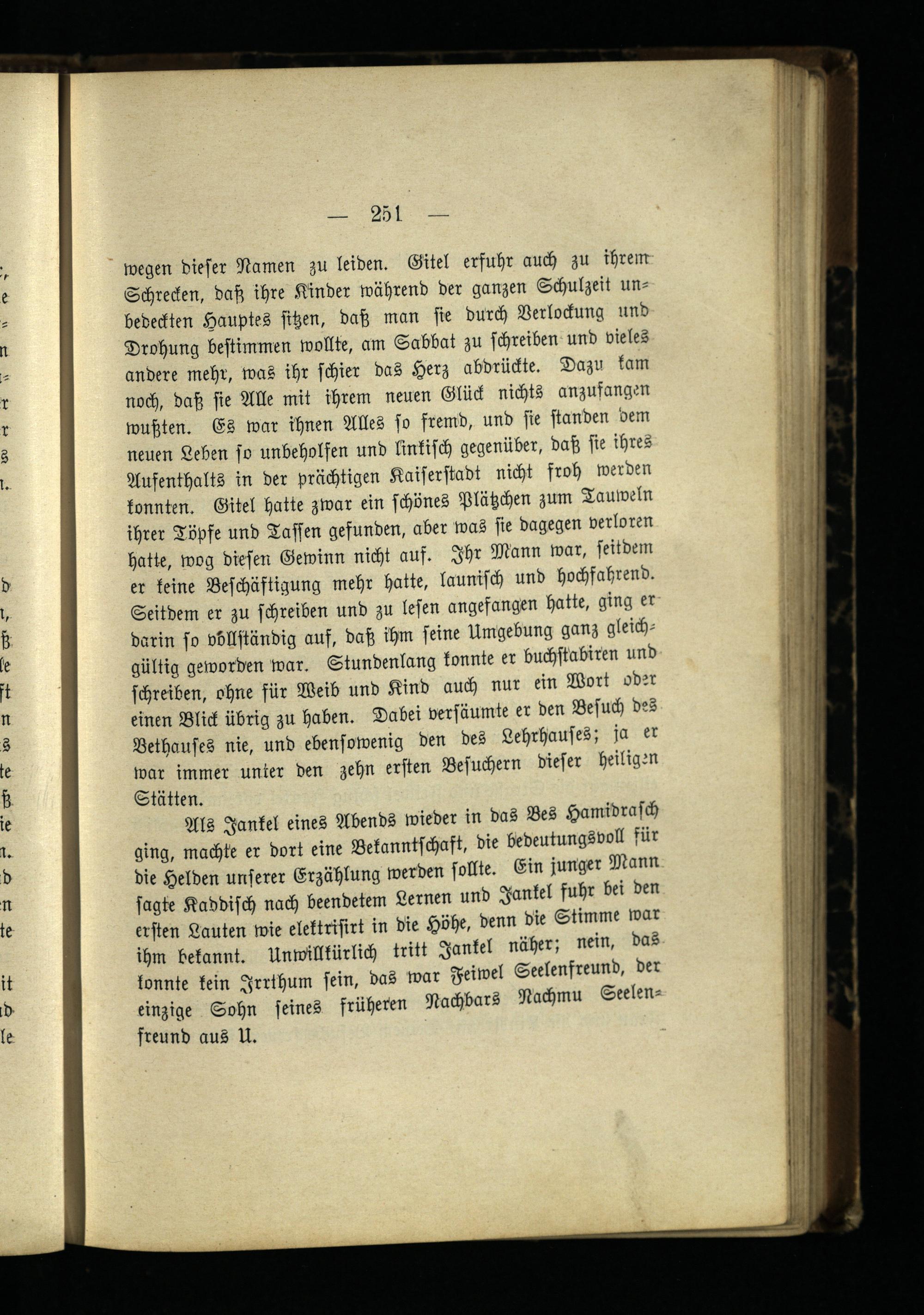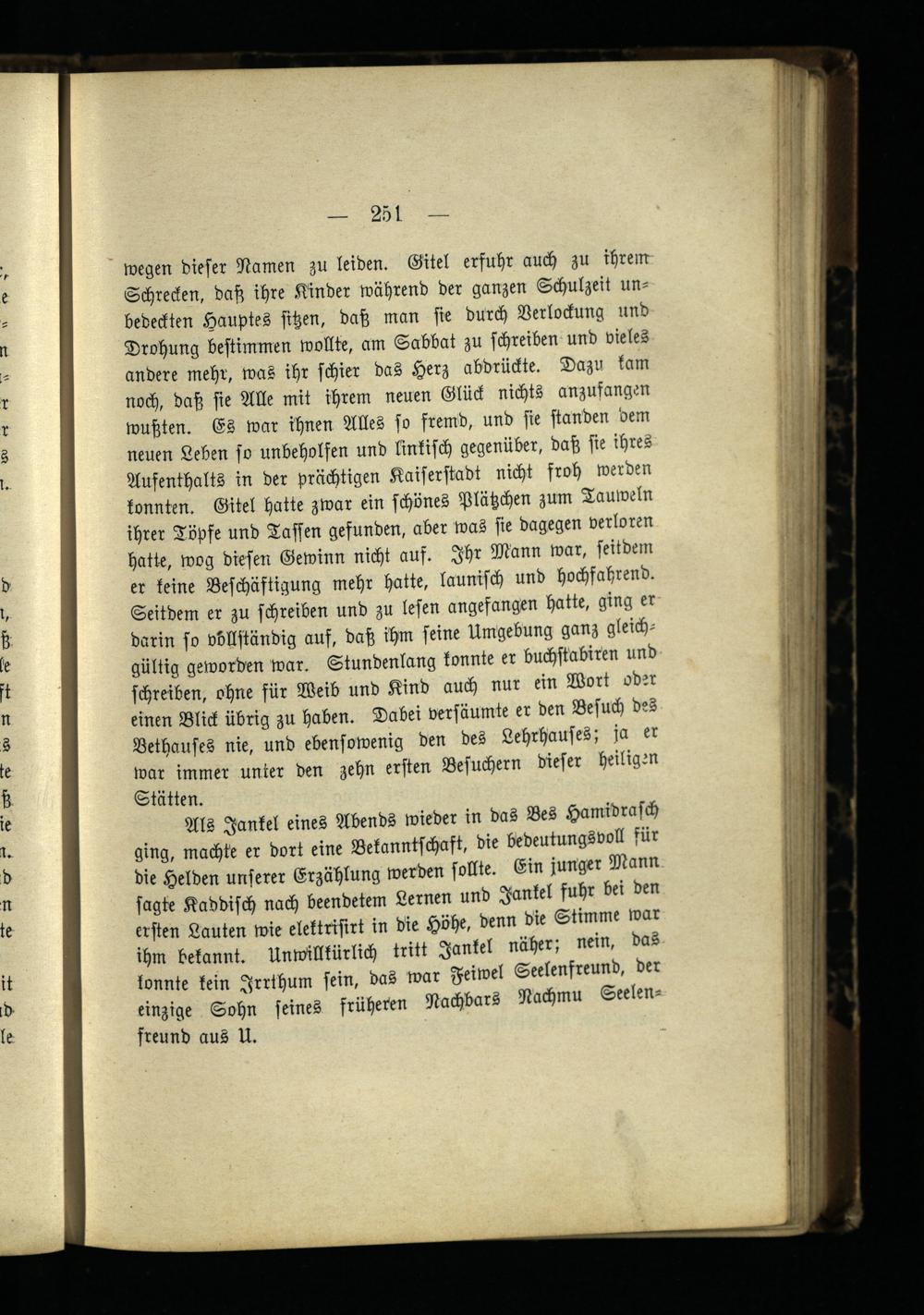 Als Jankel eines Abends wieder in das Bes Hamidrasch ging, machte er dort eine Bekanntschaft, die bedeutungsvoll für die Helden unserer Erzählung werden sollte. Ein junger Mann sagte Kaddisch nach beendetem Lernen und Jankel fuhr bei den ersten Lauten wie elektrisirt in die Höhe, denn die Stimme war ihm bekannt. Unwillkürlich tritt Jankel näher; nein, das konnte kein Jrrthum sein, das war Feiwel Seelenfreund, der einzige Sohn seines früheren Nachbars Nachmu Seelenfreund aus U.