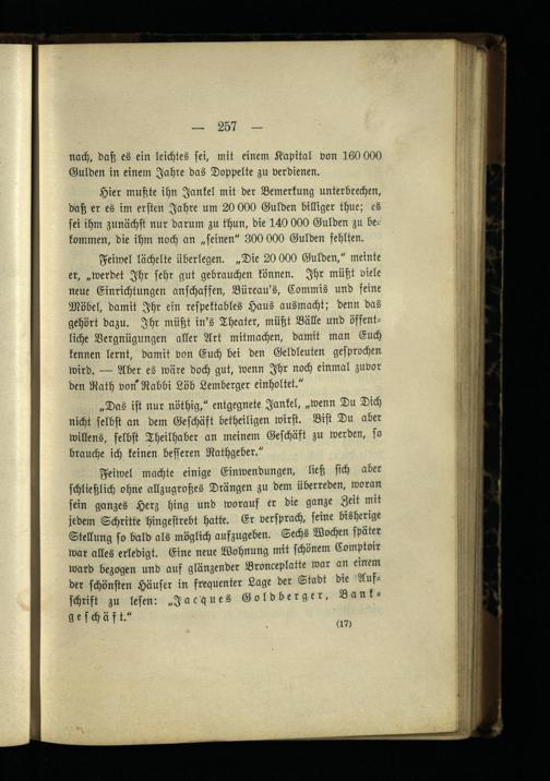 Feiwel machte einige Einwendungen, ließ sich aber schließlich ohne allzugroßes Drängen zu dem überreden, woran sein ganzes Herz hing und worauf er die ganze Zeit mit jedem Schritte hingestrebt hatte. Er versprach, seine bisherige Stellung so bald als möglich aufzugeben. Sechs Wochen später war alles erledigt. Eine neue Wohnung mit schönem Comptoir ward bezogen und auf glänzender Bronceplatte war an einem der schönsten Häuser in frequenter Lage der Stadt die Aufschrift zu lesen: „Jacques Goldberger, Bank- geschäf t."