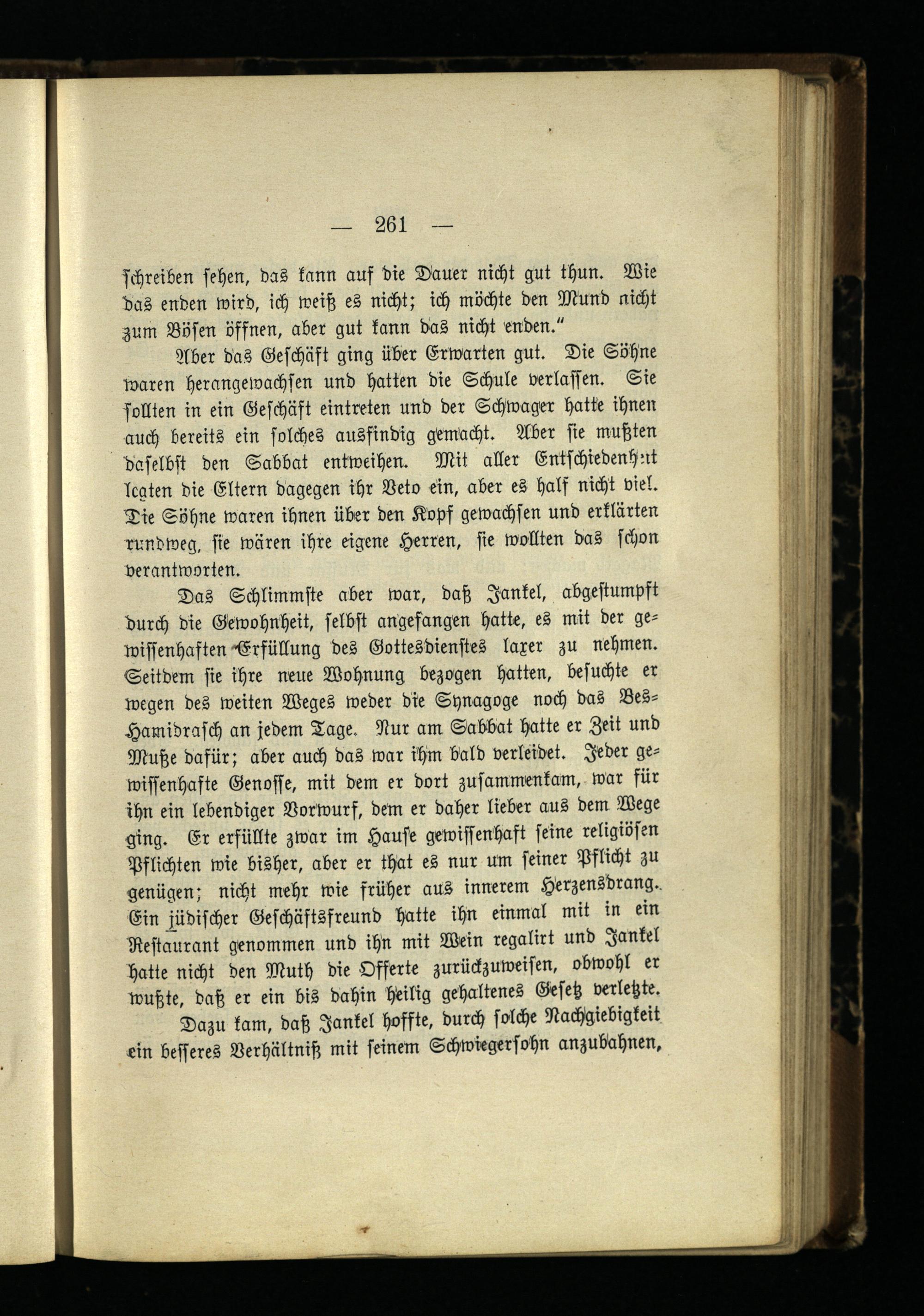 Das Schlimmste aber war, daß Jankel, abgestumpft durch die Gewohnheit, selbst angefangen hatte, es mit der gewissenhaften "Erfüllung des Gottesdienstes laxer zu nehmen. Seitdem sie ihre neue Wohnung bezogen hatten, besuchte er wegen des weiten Weges weder die Synagoge noch das Bes- Hamidrasch an jedem Tage. Nur am Sabbat hatte er Zeit und Mutze dafür; aber auch das war ihm bald verleidet. Jeder gewissenhafte Genosse, mit dem er dort zusammenkam, war für ihn ein lebendiger Vorwurf, dem er daher lieber aus dem Wege ging. Er erfüllte zwar im Hause gewissenhaft seine religiösen Pflichten wie bisher, aber er that es nur um seiner Pflicht zu genügen; nicht mehr wie früher aus innerem Herzensdrang.. Ein jüdischer Geschäftsfreund hatte ihn einmal mit in ein Restaurant genommen und ihn mit Wein regalirt und Jankel hatte nicht den Muth die Offerte zurückzuweisen, obwohl er wußte, daß er ein bis dahin heilig gehaltenes Gesetz verletzte.