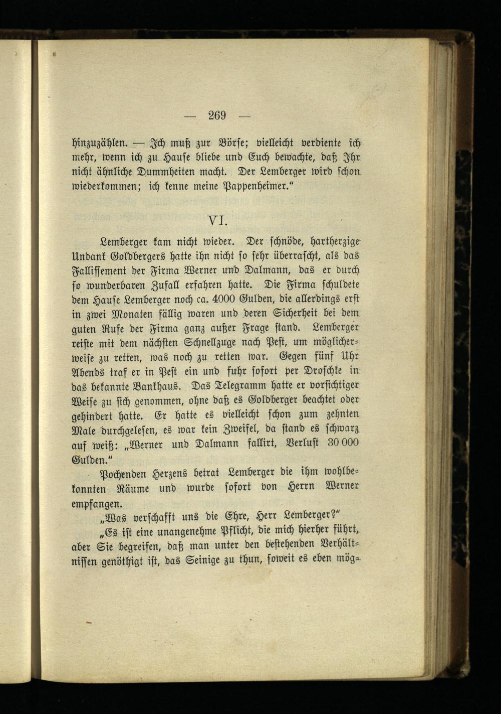 Lemberger kam nicht wieder. Der schnöde, hartherzige- Undank Goldbergers hatte ihn nicht so sehr überrascht, als das Fallissement der Firma Werner und Dalmann, das er durch so wunderbaren Zufall erfahren hatte. Die Firma schuldete dem Hause Lemberger noch ca. 4000 Gülden, die allerdings erst in zwei Monaten fällig waren und deren Sicherheit bei dem guten Rufe der Firma ganz außer Frage stand. Lemberger reiste mit dem nächsten Schnellzuge nach Pest, um möglicherweise zu retten, was noch zu retten war. Gegen fünf Uhr Abends traf er in Pest ein und fuhr sofort per Droschke in das bekannte Bankhaus. Das Telegramm hatte er vorsichtiger Weise zu sich genommen, ohne daß es Goldberger beachtet oder gehindert hatte. Er hatte es vielleicht schon zum zehnten Male durchgelescn, es war kein Zweifel, da stand es schwarz auf weiß: „Werner und Dalmann fallirt, Verlust 30 000 Gulden."