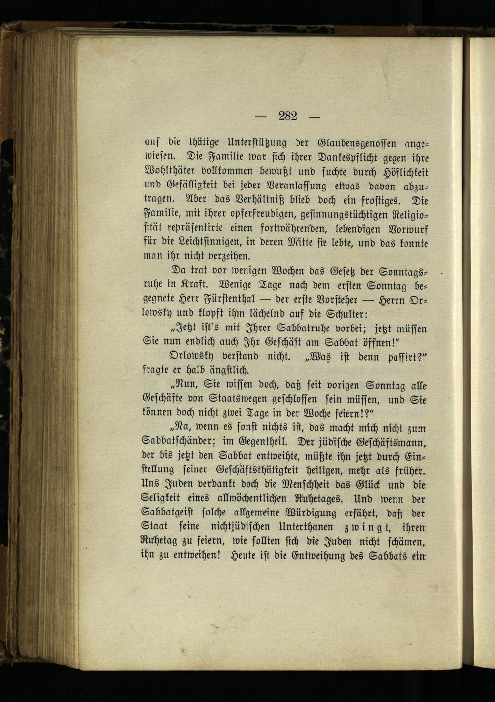 Da trat vor wenigen Wochen das Gesetz der Sonntagsruhe in Kraft. Wenige Tage nach dem ersten Sonntag begegnete Herr Fürstenthal — der erste Vorsteher — Herrn Or- lowsky und klopft ihm lächelnd auf die Schulter: