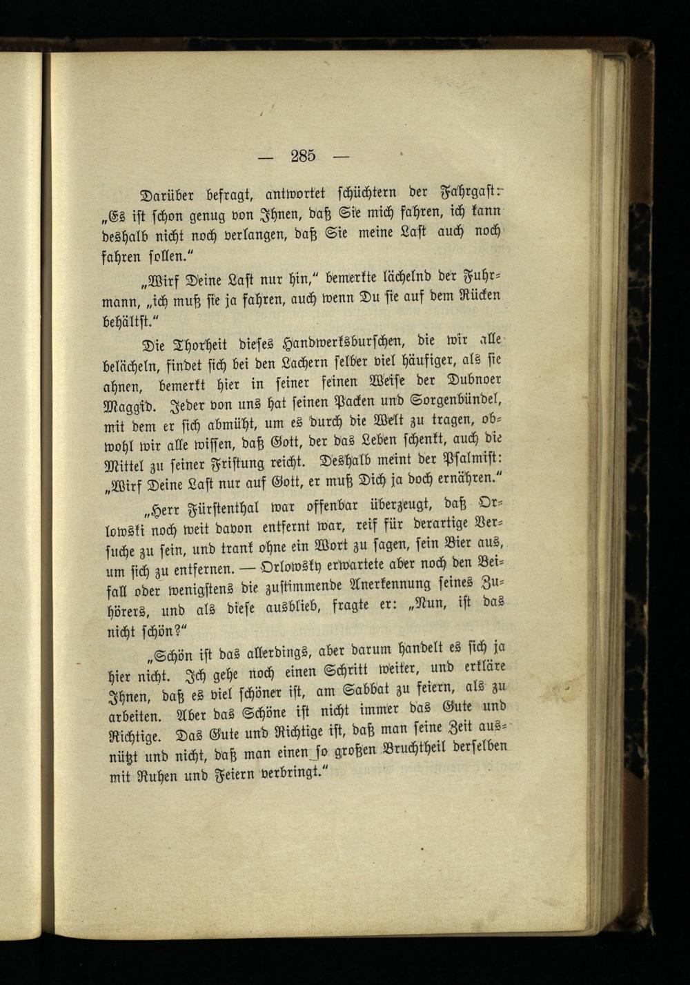 „Schön ist das allerdings, aber darum handelt es sich ja hier nicht. Ich gehe noch einen Schritt weiter, und erkläre Ihnen, daß es viel schöner ist, am Sabbat zu feiern, als zu arbeiten. Aber das Schöne ist nicht immer das Güte und Richtige. Das Güte und Richtige ist, daß man seine Zeit aus- niitzt und nicht, daß man einen so großen Bruchtheil derselben mit Ruhen und Feiern verbringt."