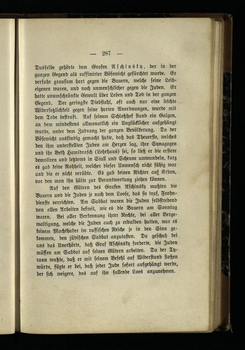 Auf den Gütern des Grafen Aschinsky mußten die Bauern und die Juden je nach dem Loose, das sie traf, Frohn- dienste verrichten. Am Sabbat waren die Juden selbstredend von allen Arbeiten befreit, wie es die Bauern am Sonntag waren. Bei aller Verkennung ihrer Rechte, bei aller Vergewaltigung, welche die Juden auch zu erdulden hatten, war es keinem Machthaber im russischen Reiche je in den Sinn gekommen, den jüdischen Sabbat anzutasten. Da geschah bei uns das Unerhörte, daß Graf Aschinsky forderte, die Juden müssen am Sabbat auf seinen Gütern arbeiten. Da der Tyrann wußte, daß er mit seinem Befehl auf Widerstand stoßen würde, fügte er bei, daß jeder Jude sofort aufgehängt werde, der sich weigere, das auf ihn fallende Loos anzunehmen.