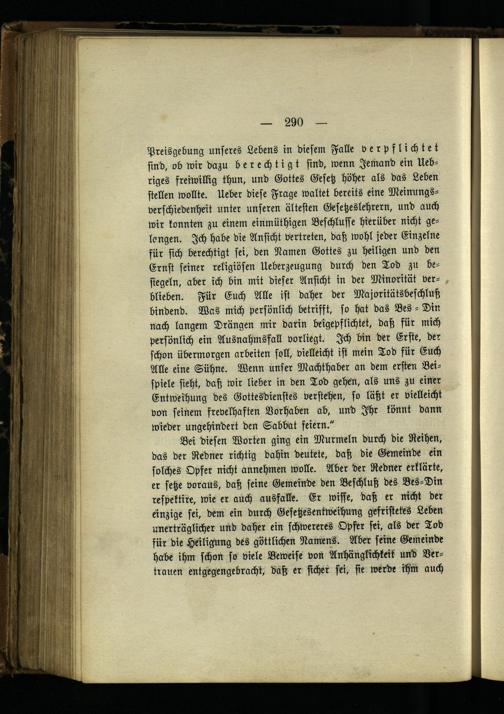 Bei diesen Worten ging ein Murmeln durch die Reihen, das der Redner richtig dahin deutete, daß die Gemeinde ein solches Opfer nicht annehmen wolle. Aber der Redner erklärte, er setze voraus, daß seine Gemeinde den Beschluß des Bes-Din respektire, wie er auch ausfalle. Er wisse, daß er nicht der einzige sei, dem ein durch Gefetzesentweihung gefristetes Leben unerträglicher und daher ein schwereres Opfer sei, als der Tod für die Heiligung des göttlichen Namens. Aber seine Gemeinde Hab« ihm schon so viele Beweise von Anhänglichkeit' und Vertrauen entgegengebracht, daß er sicher sei, sie werde ihm auch