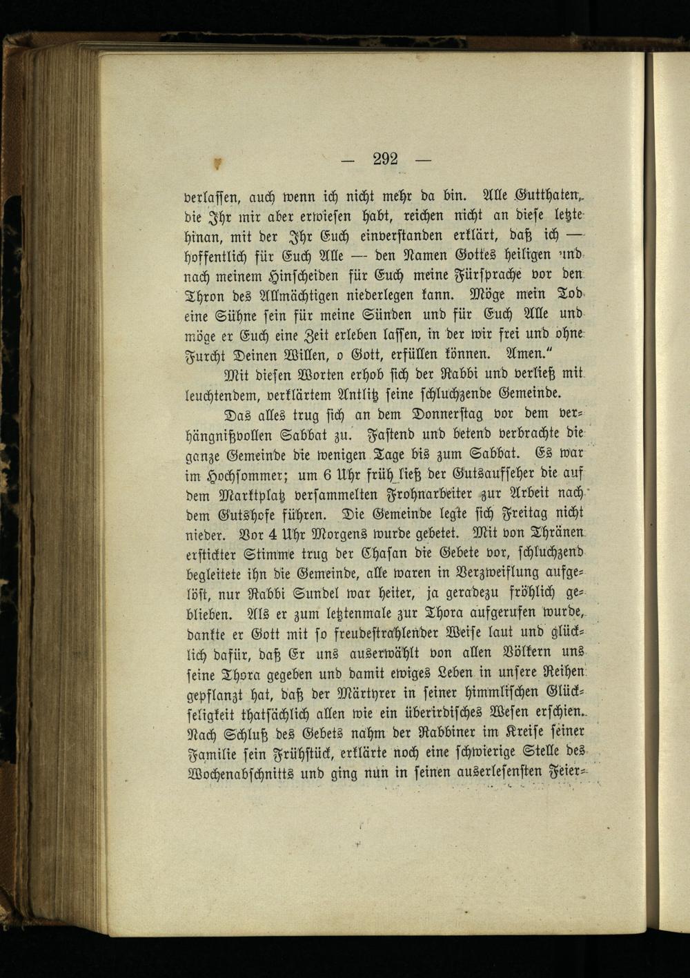Das alles trug sich an dem Donnerstag vor dem ver- hängnißvollen Sabbat zu. Fastend und betend verbrachte die ganze Gemeinde die wenigen Tage bis zum Sabbat. Es war im Hochsommer; um 6 Uhr früh ließ der Gutsaufseher die aus dem Marktplatz versammelten Frohnarbeiter zur Arbeit nach dem GUtshofe führen. Die Gemeinde legte sich Freitag nicht nieder. Vor 4 Uhr Morgens wurde gebetet. Mit von Thränen, erstickter StimtUe trug der Chasan die Gebete vor, schluchzend begleitete ihn die Gemeinde, alle waren in Verzweiflung aufgelöst, nur Rabbi Sundel war heiter, ja geradezu fröhlich geblieben. Als er zum letztenmale zur Thora aufgerufen wurde, dankte er Gott mit so freudestrahlender Weise laut und glücklich dafür, daß Er uns auserwählt von allen Völkern uns seine Thora gegeben und damit ewiges Leben in unsere Reihen gepflanzt hat, daß der Märtyrer in seiner himmlischen Glückseligkeit thatsächlich allen wie ein überirdisches Wesen erschien.. Nach Schluß des Gebets nahm der Rabbiner im Kreise seiner Familie sein Frühstück, erklärte Noch eine schwierige Stelle des Wochenabschnitts und ging nun in seinen auserlesensten Feier-