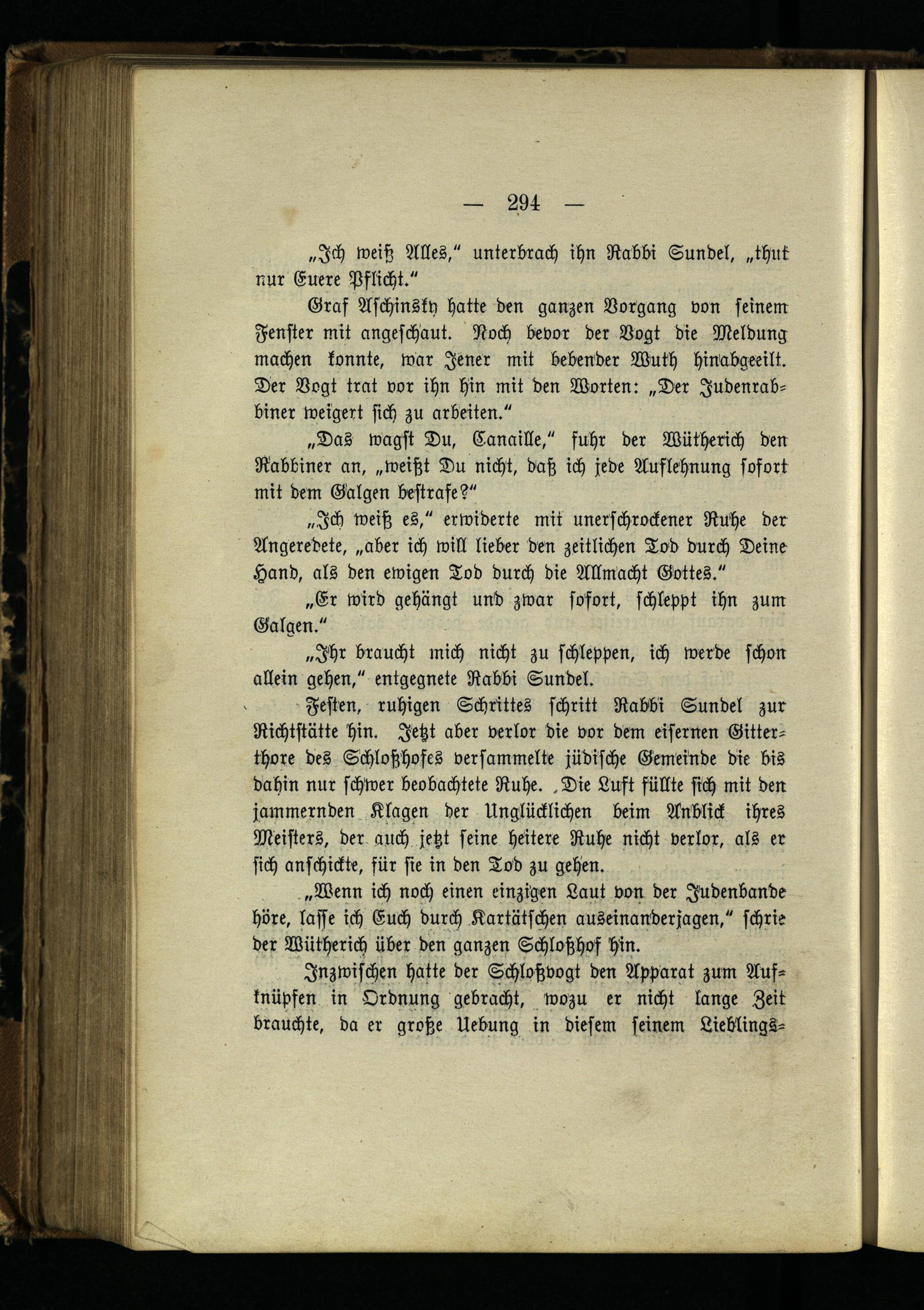 Graf Aschinsky hatte den ganzen Vorgang von seinem Fenster mit angeschaut. Noch bevor der Vogt die Meldung machen konnte, war Jener mit bebender Wuth hinabgeeilt. Der Vogt trat vor ihn hin mit den Worten: „Der Judenrabbiner weigert sich zu arbeiten."
