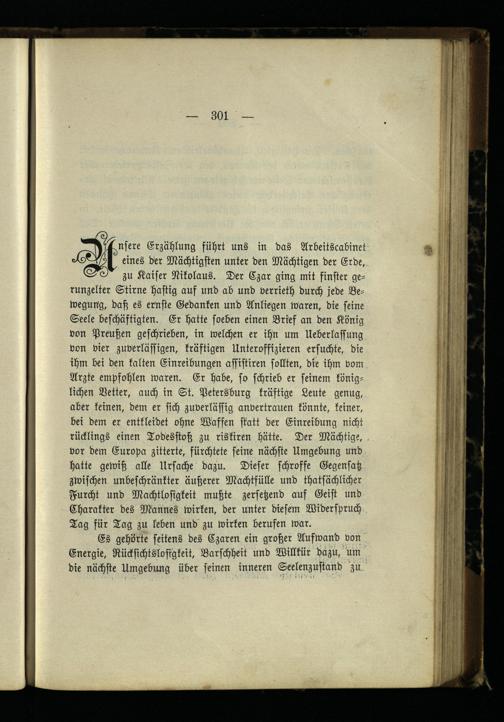 ^nsere Erzählung führt uns in das Arbeitscabinet eines der Mächtigsten unter den Mächtigen der Erde, zu Kaiser Nikolaus. Der Czar ging mit finster gerunzelter Stirne hastig auf und ab und verrieth durch jede Bewegung, daß es er'nste Gedanken und Anliegen wären, die seine Seele beschäftigten. Er hatte soeben einen Brief an den König von Prmßen geschrieben, in welchen er ihn um Ueberlassung von vier zuverlässigen, kräftigen Unteroffizieren ersuchte, die ihm bei den kalten Einreibungen assistiren sollten, die ihm vom Arzte empfohlen waren. Er habe, so schrieb er seinem königlichen Vetter, auch in St. Petersburg kräftige Leute genug, aber keinen, dem er sich zuverlässig anvertrauen könnte, keiner, bei dem er entkleidet ohne Waffen statt der Einreibung nicht rücklings einen Todesstoß zu riskiren hätte. Der Mächtige, vor dem Europa zitterte, fürchtete seine nächste Umgebung und hatte gewiß alle Ursache dazu. Dieser schroffe Gegensatz zwischen unbeschränkter äußerer Machtslllle und thatsächlicher Furcht und Machtlosigkeit mußte zersetzend auf Geist und Charakter des Mannes wirken, der unter diesem Widerspruch Tag für Tag zu leben und zu wirken berufen war.