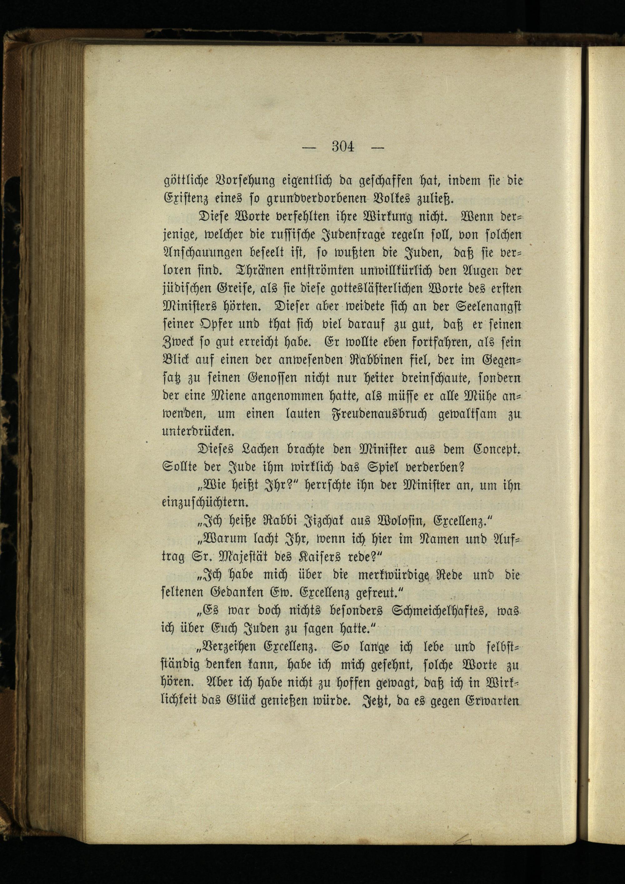 Diese Worte verfehlten ihre Wirkung nicht. Wenn derjenige, welcher die russische Judenfrage regeln soll, von solchen Anschauungen beseelt ist, so wußten die Juden, daß sie verloren sind. Thränen entströmten unwillkürlich den Augen der jüdischen Greise, als sie diese gotteslästerlichen Worte des ersten Ministers hörten. Dieser aber weidete sich an der Seelenangst seiner Opfer und that sich viel darauf zu gut, daß er seinen Zweck so gut erreicht habe. Er wollte eben fortfahren, als sein Blick auf einen der anwesenden Rabbinen fiel, der im Gegensatz zu seinen Genossen nicht nur heiter dreinschaute, sondern der eine Miene angenommen hatte, als müsse er alle Mühe anwenden, um einen lauten Freudenausbruch gewaltsam zu unterdrücken.