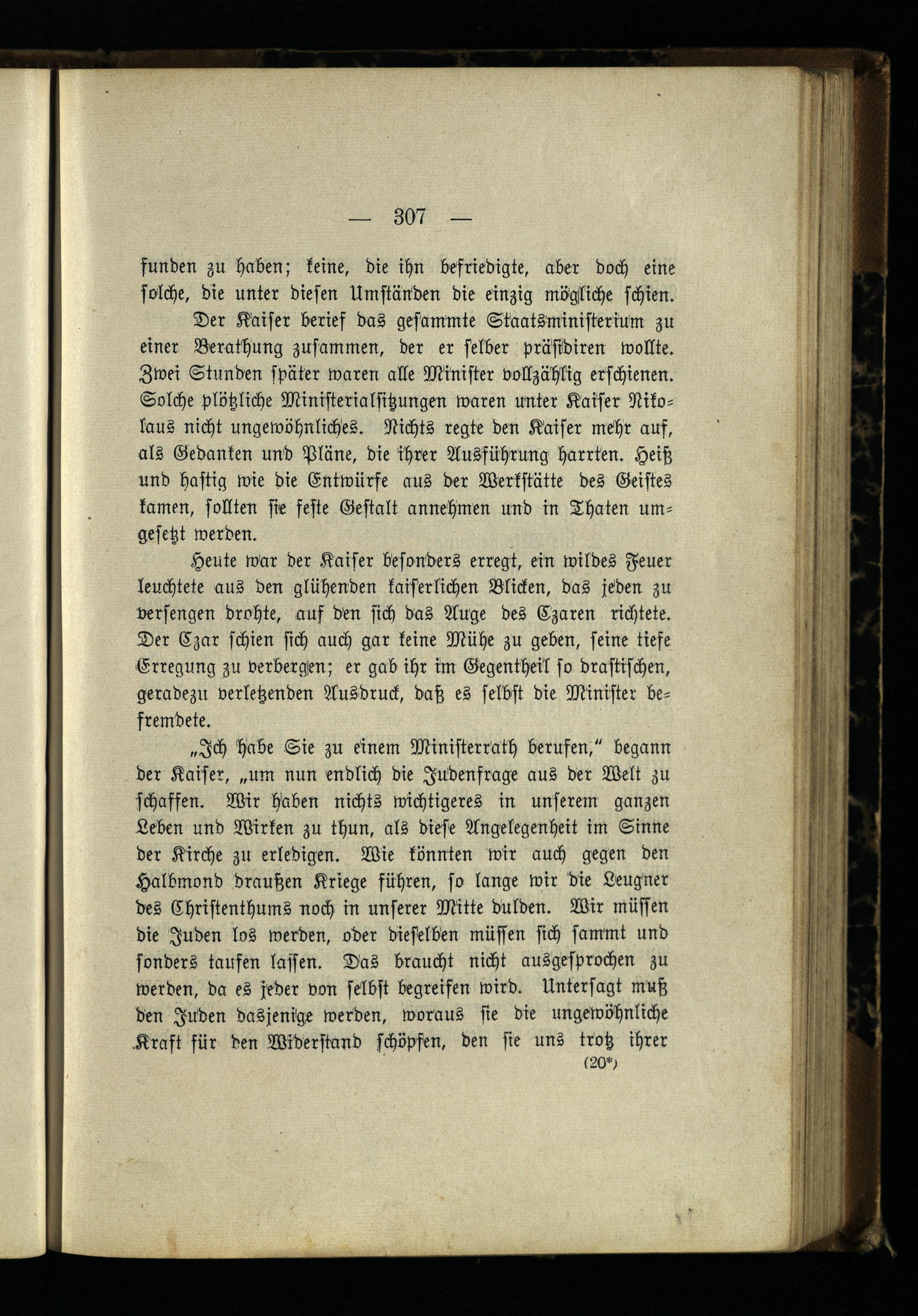„Ich habe Sie zu einem Ministerrath berufen," begann der Kaiser, „um nun endlich die Judenfrage aus der Welt zu schassen. Wir haben nichts wichtigeres in unserem ganzen Leben und Wirken zu thun, als diese Angelegenheit im Sinne der Kirche zu erledigen. Wie könnten wir auch gegen den Halbmond draußen Kriege führen, so lange wir die Leugner des Christenthums noch in unserer Mitte dulden. Wir müssen die Juden los werden, oder dieselben müssen sich sammt und sonders taufen lassen. Das braucht nicht ausgesprochen zu werden, da es jeder von selbst begreifen wird. Untersagt muß den Juden dasjenige werden, woraus sie die ungewöhnliche Kraft für den Widerstand schöpfen, den sie uns trotz ihrer