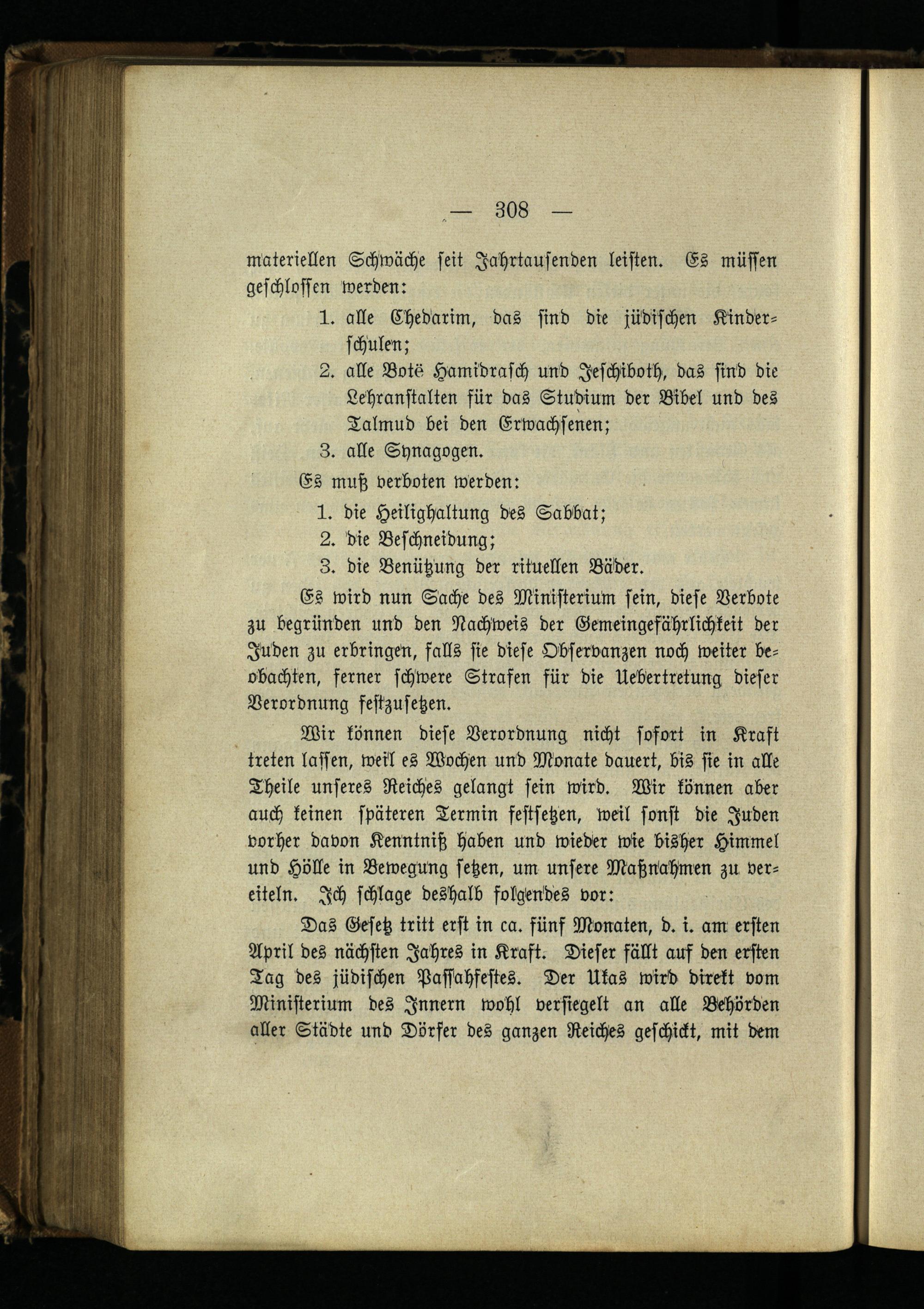 Es wird nun Sache des Ministerium sein, diese Verbote zu begründen und den Nachweis der Gemeingefährlichkeit der Juden zu erbringen, falls sie diese Observanzen noch weiter beobachten, ferner schwere Strafen für die Uebertretung dieser Verordnung festzusetzen.