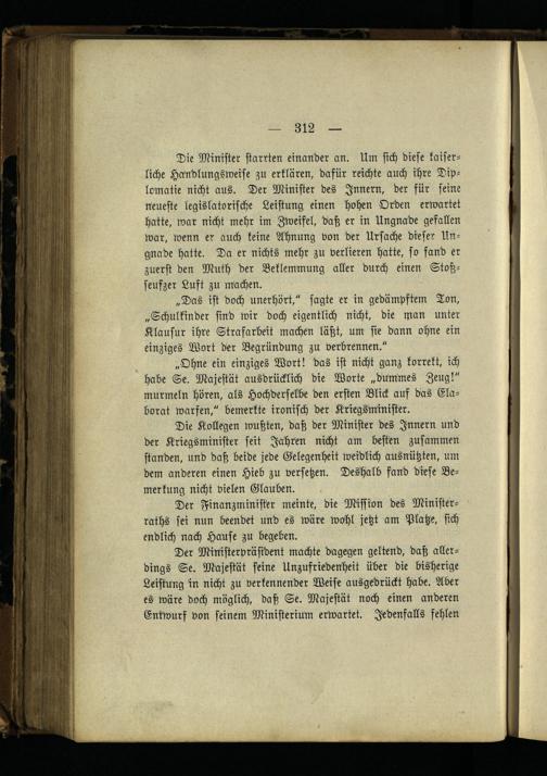 „Ohne ein einziges Wort! das ist nicht ganz korrekt, ich habe Se. Majestät ausdrücklich die Worte „dummes Zeug!" murmeln hören, als HochderfÄbe den ersten Blick auf das Elaborat warfen," bemerkte ironisch der Kriegsminifter.