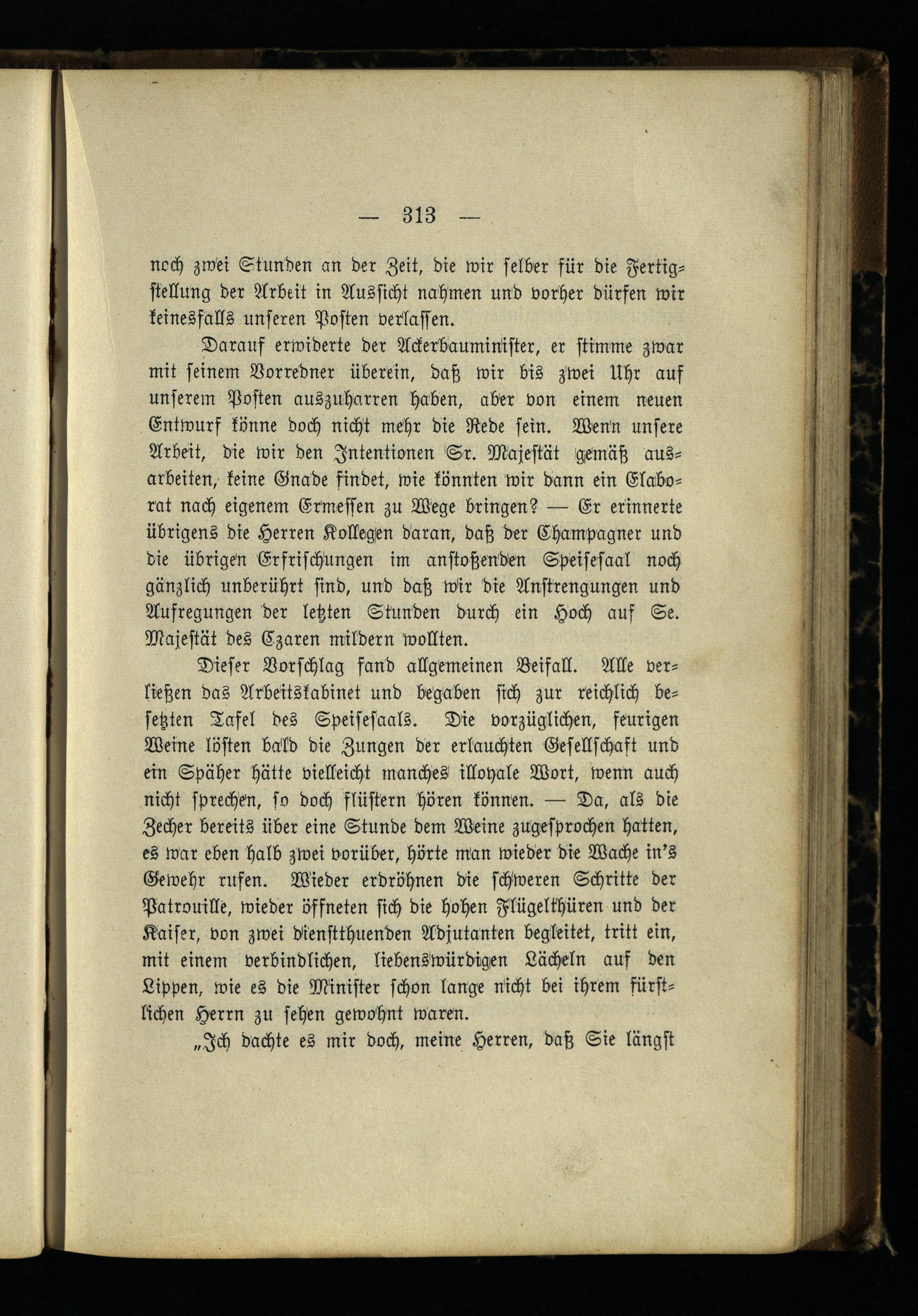 Darauf erwiderte der Aüerbauminister, er stimme zwar mit seinem Vorredner überein, daß wir bis zwei Uhr auf unserem Posten auszuharren haben, aber von einem neuen Entwurf könne doch nicht mehr die Rede sein. Wenn unsere Arbeit, die wir den Intentionen Sr. Majestät gemäß ausarbeiten, keine Gnade findet, wie könnten wir dann ein Elaborat nach eigenem Ermessen zu Wege bringen? — Er erinnerte übrigens die Herren Kollegen daran, daß der Champagner und die übrigen Erfrischungen im anstoßenden Speisesaal noch gänzlich unberührt sind, und daß wir die Anstrengungen und Aufregungen der letzten Stunden durch ein Hoch auf Se. Majestät des Czaren mildern wollten.