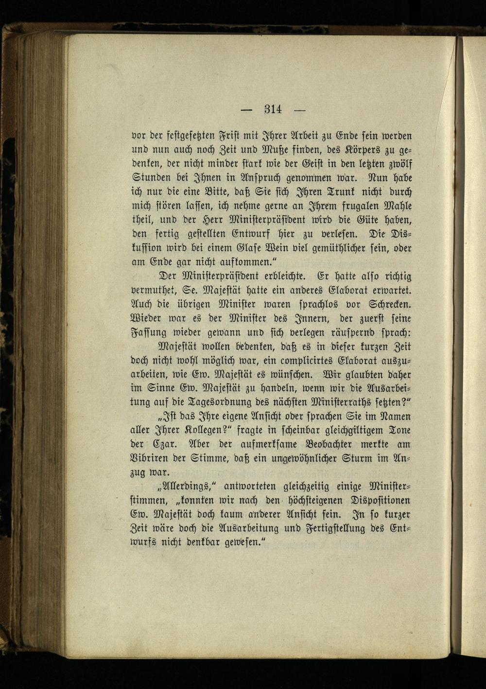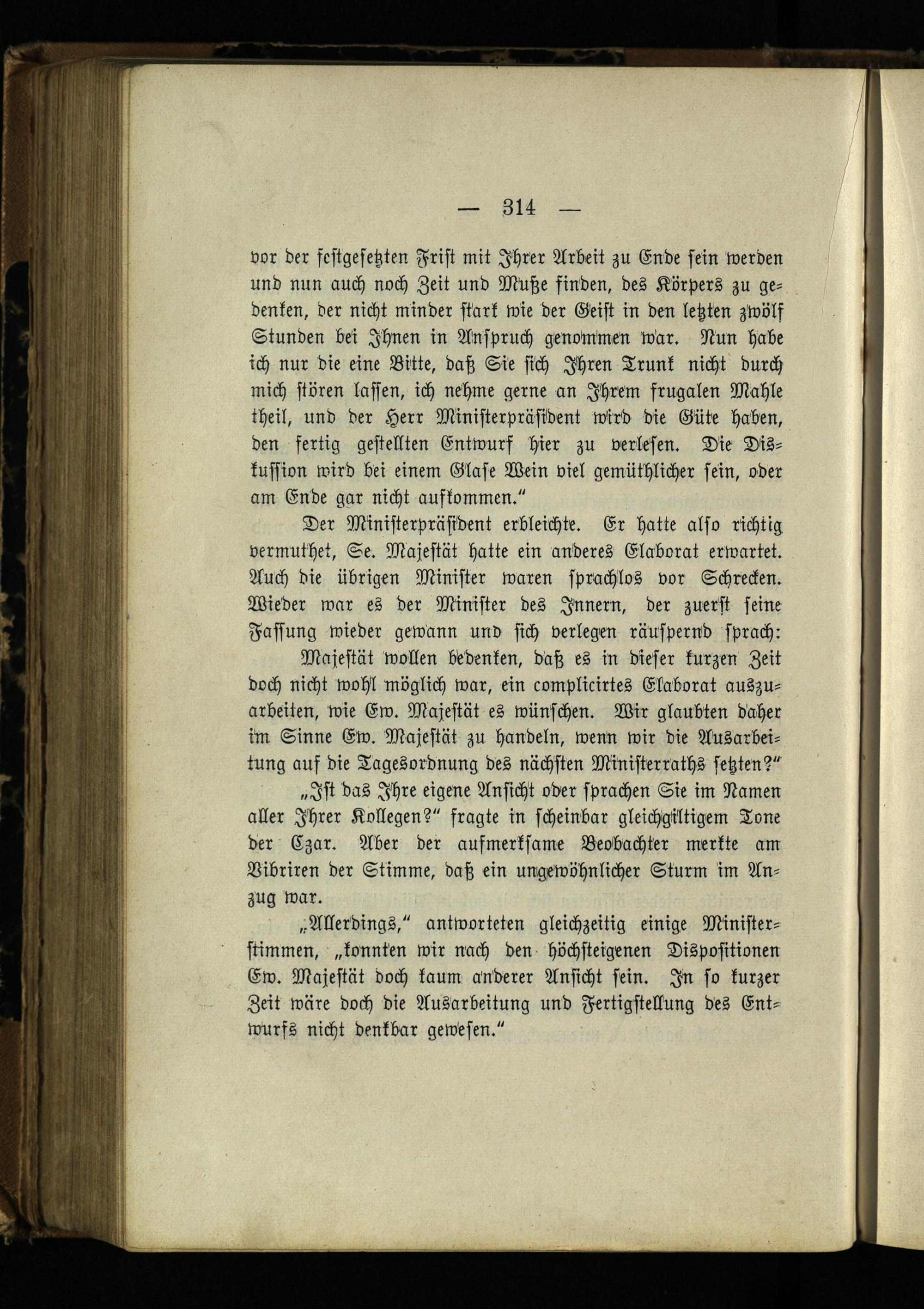 Der Ministerpräsident erbleichte. Er hatte also richtig vermuthet, Se. Majestät hatte ein anderes Elaborat erwartet. Auch die übrigen Minister waren sprachlos vor Schrecken. Wieder war es der Minister des Innern, der zuerst seine Fassung wieder gewann und sich verlegen räuspernd sprach: