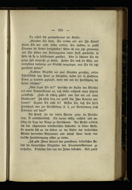 „Ich gebe Ihnen hiermit den gemessenen, kaiserlichen Befehl die sämmtlichen Mitglieder des Staatsministeriums zu verhaften. Dieselben sind von den Juden bestochen. Seit zwölf