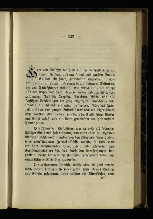 Herr Ignaz von Kirschsteiner war ein mehr als siebenzig- jähriger Greis von hoher Statur, und wenn er da im eleganten türkischen Schlasrock, umgeben von den Häuptern seiner Lieben, feine meerfchäumene Jomtof - Pfeife rauchte, so hatte man ein Bild wohlhabender Behaglichkeit und patriarchalischen Familienglückes vor sich, das selbst den Straßenjungen im- ponirte, welche die herrliche Festhütte herbeigelockt hatte, um einige lüsterne Blicke hineinzuwerfen.
