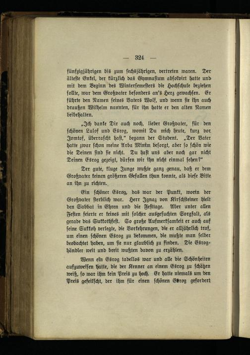 Ein schöner Esrog, das war der Punkt, worin der Großvater sterblich war. Herr Ignaz von Kirschsteiner hielt den Sabbat in Ehren und die Festtage. Aber unter allen Festen feierte er keines mit solcher ausgesuchten Sorgfalt, als gerade das SUkkothfest. So große Aufmerksamkeit er auch auf seine Sukkoh verlegte, die Vorkehrungen, die er alljährlich traf, um einen schönen Esrog zu bekommen, die mußte man selber beobachtet haben, um sie nur glaublich zu finden. Die Esrog- händler weit und breit wußten davon zu erzählen.