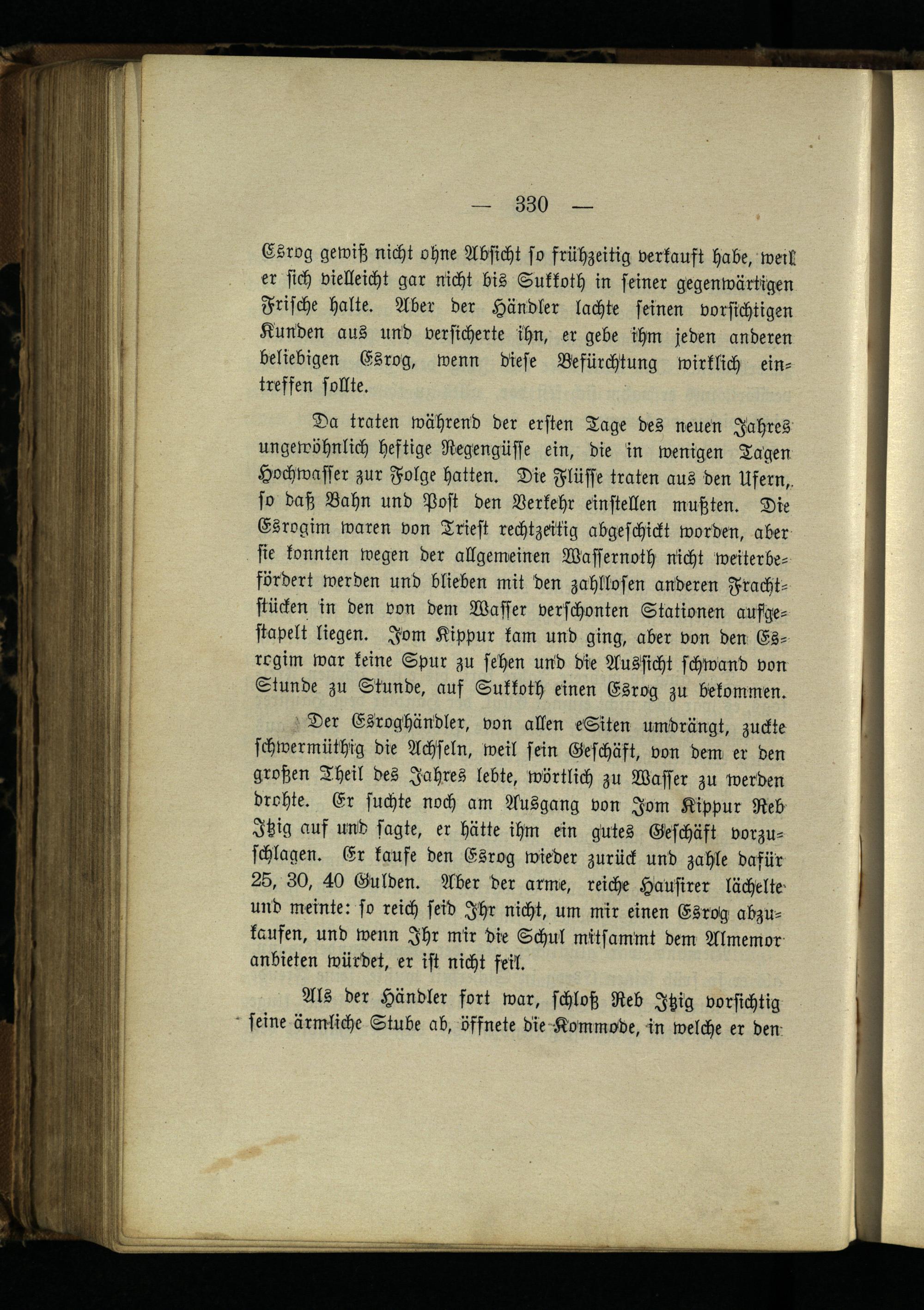 Da traten während der ersten Tage des neuen Jahres ungewöhnlich heftige Regengüsse ein, die in wenigen Tagen Hochwasser zur Folge hatten. Die Flüsse traten aus den Ufern,, so daß Bahn und Post den Verkehr einstellen mußten. Die Esrogim waren von Triest rechtzeitig abgeschickt worden, aber sie konnten wegen der allgemeinen Wassernoth nicht weiterbefördert werden und blieben mit den zahllosen anderen Frachtstücken in den von dem Wasser verschonten Stationen aufgestapelt liegen. Jom Kippur kam und ging, aber von den Esrogim war keine Spur zu sehen und die Aussicht schwand von Stunde zu Stunde, auf Sukkoth einen Esrog zu bekommen.