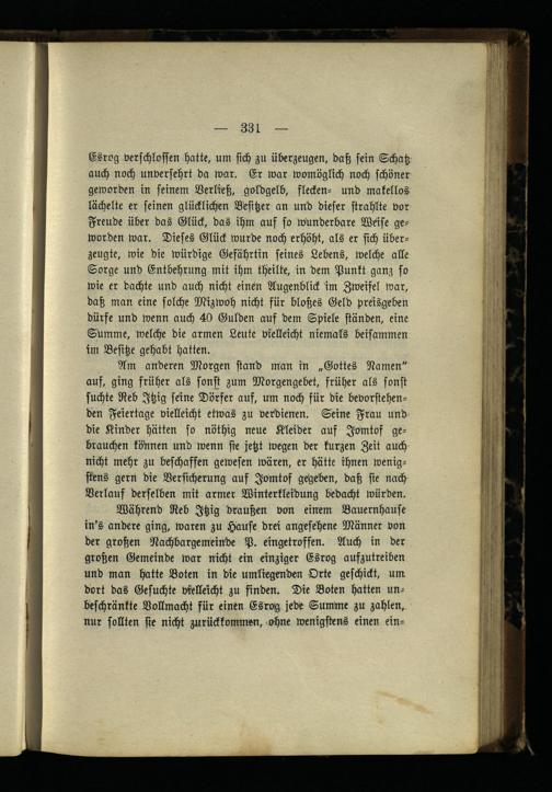 Am anderen Morgen stand man in „Gottes Namen" auf, ging früher als sonst zum Morgengebet, früher als sonst suchte Reb Itzig seine Dörfer auf, um noch für die bevorstehenden Feiertage vielleicht etwas zu verdienen. Seine Frau und die Kinder hätten so nöthig neue Kleider auf Jomtof gebrauchen können und wenn sie jetzt wegen der kürzen Zeit auch nicht mehr zu beschaffen gewesen wären, er hätte ihnen wenigstens gern die Versicherung auf Jomtof gegeben, daß sie nach Verlauf derselben mit armer Winterkleidung bedacht würden.
