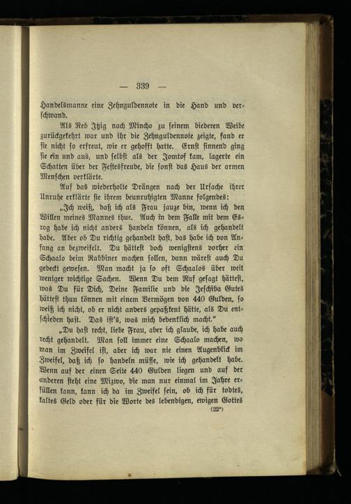 „Du hast recht, liebe Frau, aber ich glaube, ich habe auch recht gehandelt. Man soll immer eine Schaalo machen, wo man im Zweifel ist, aber ich war nie einen Augenblick im Zweifel, daß ich so handeln müsse, wie ich gehandelt habe. Wenn auf der einen Seite 440 Gülden liegen und auf der anderen steht eine Mizwo, die man nur einmal im Jahre erfüllen kann, kann ich da im Zweifel sein, ob ich für todtes, kaltes Geld oder für die Worte des lebendigen, ewigen Gottes