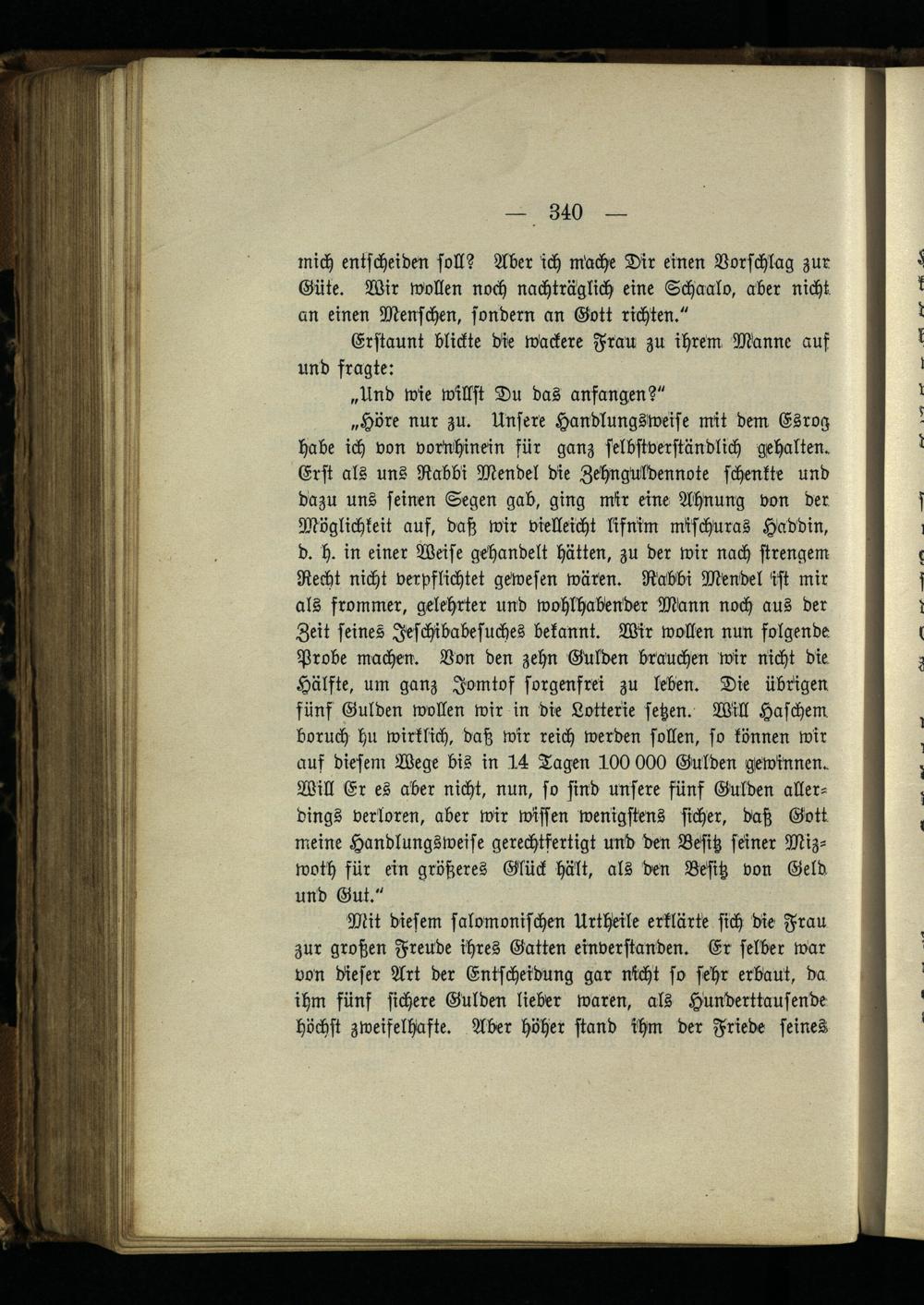 Mit diesem salomonischen Urtheile erklärte sich die Frau zur großen Freude ihres Gatten einverstanden. Er selber War von dieser Art der Entscheidung gar nicht so sehr erbaut, da l ihm fünf sichere Gulden lieber waren, als Hunderttausende höchst zweifelhafte. Aber höher stand ihm der Friede seines