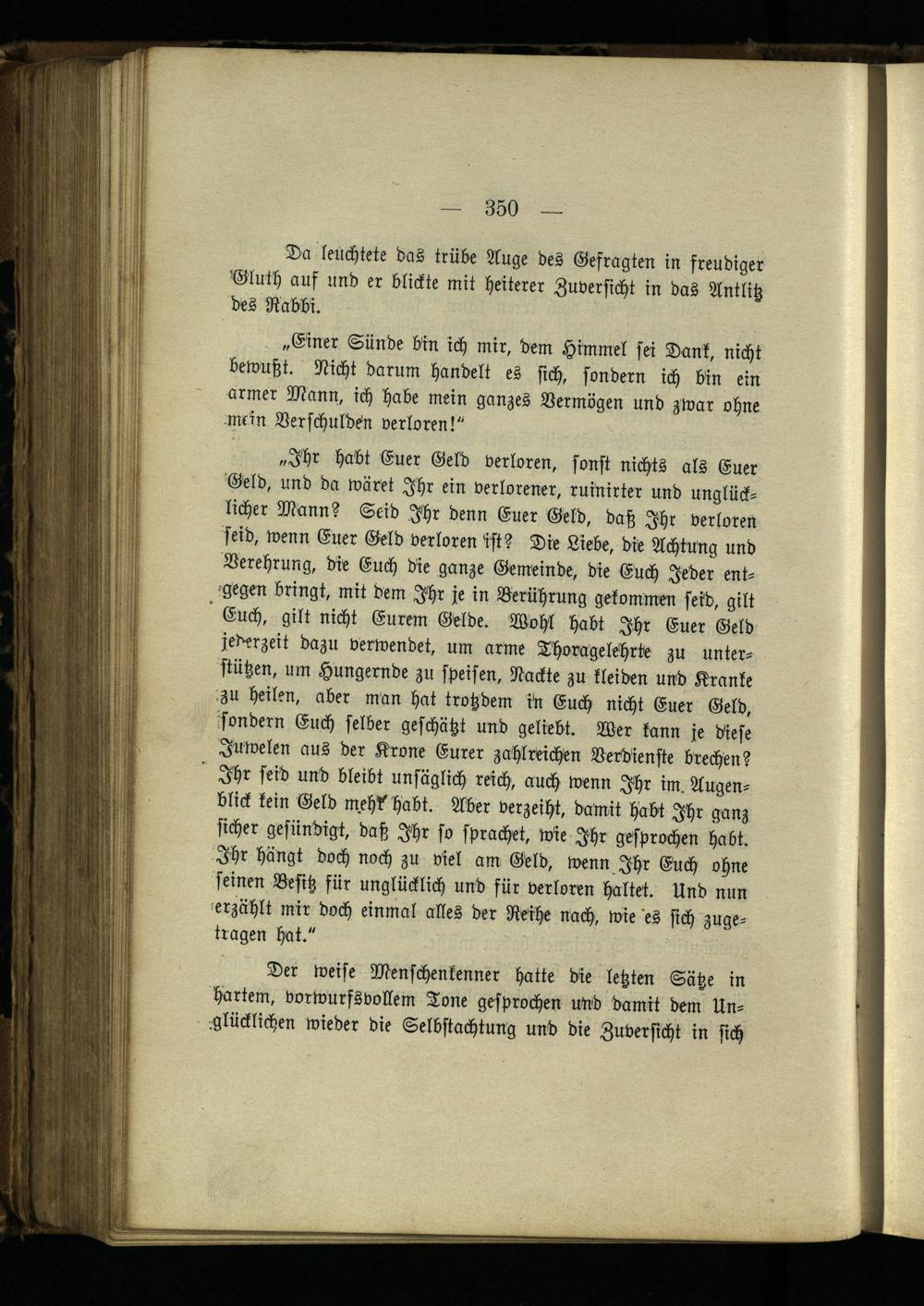 „Ihr habt Euer Geld verloren, sonst nichts als Euer Veld, und da wäret Ihr ein verlorener, ruinirter und unglücklicher Mann? Seid Ihr denn Euer Geld, daß Ihr verloren seid, wenn Euer Geld verloren ist? Die Liebe, die Achtung und Verehrung, die Euch die ganze Gemeinde, die Euch Jeder entgegen bringt, mit dem Ihr je in Berührung gekommen seid, gilt Euch, gilt nicht Eurem Gelde. Wohl habt Ihr Euer Geld jederzeit dazu verwendet, um arme Thoragelchrte zu unterstützen, um Hungernde zu speisen, Nackte zu kleiden und Kranke zu heilen, aber man hat trotzdem in Euch nicht Euer Geld, sondern Euch selber geschätzt und geliebt. Wer kann je diese Juwelen aus der Krone Eurer zahlreichen Verdienste brechen? Ihr seid und bleibt unsäglich reich, auch wenn Ihr im. Augenblick kein Geld mehl" habt. Mer verzeiht, damit habt Ihr ganz sicher gesündigt, daß Ihr so sprächet, wie Ihr gesprochen habt. Ihr hängt doch noch zu viel am Geld, wenn Ihr Euch ohne seinen Besitz für unglücklich und für verloren haltet. Und nun erzählt mir doch einmal alles der Reihe nach, wie es sich zugetragen hat."