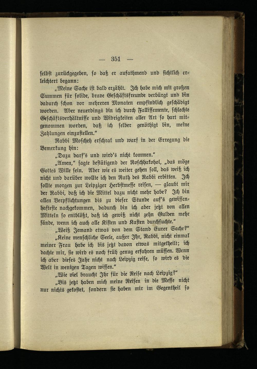 „Keine menschliche Seele, außer Ihr, Rabbi , nicht einmal meiner Frau habe ich bis jetzt davon etwas mitgetheilt; ich dachte mir, sie wird es noch früh genug erfahren müssen. Wenn ich aber dieses Jahr nicht nach Leipzig reife, so wird es die Welt in wenigen Tagen wissen."