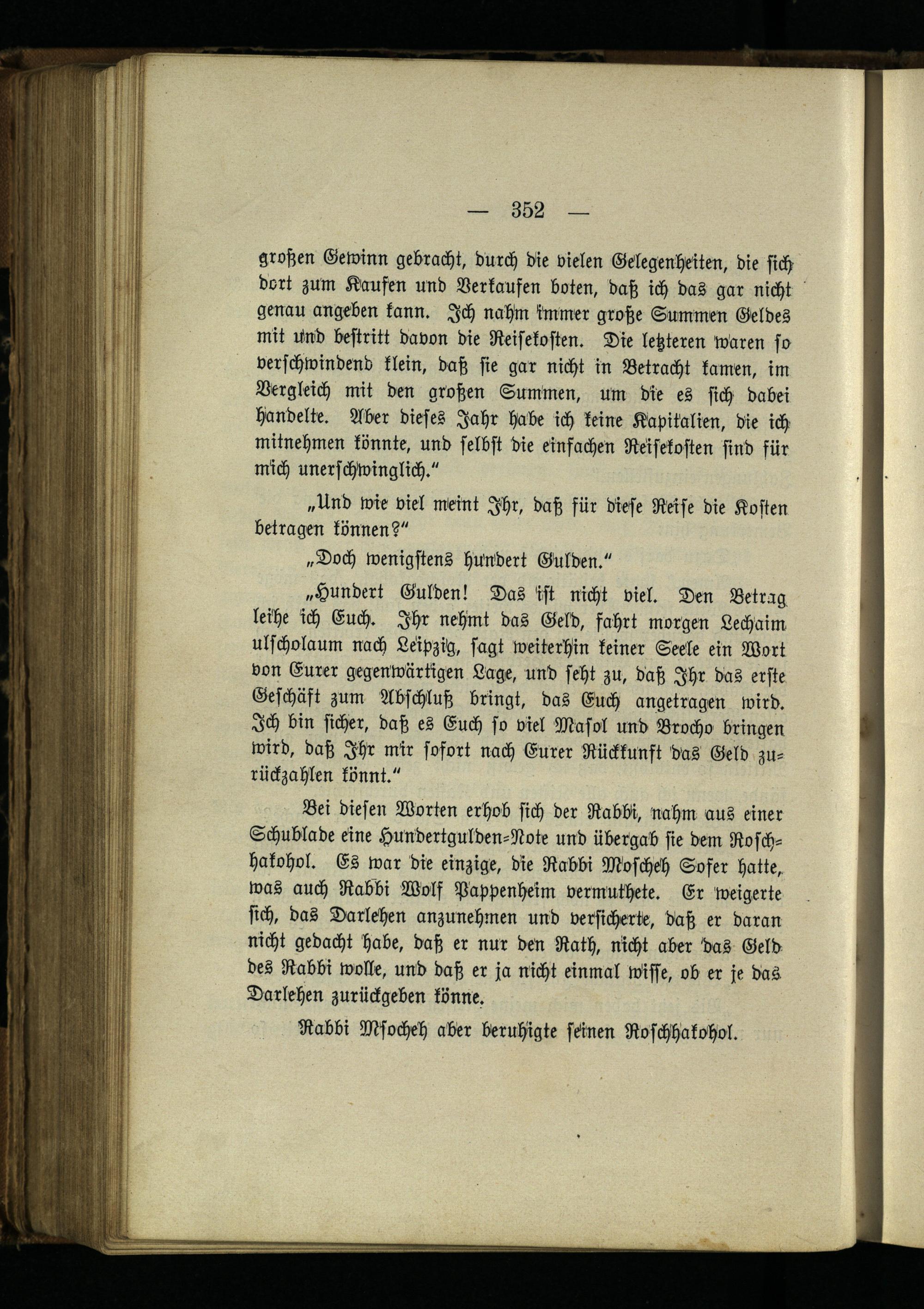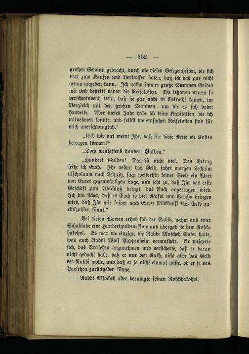 Bei diesen Worten erhob sich der Rabbi, nahm aus einer Schublade eine HuNdertgulden-Note und übergab sie dem Rosch- hakohol. Es war die einzige, die Rabbi Moschch Sofer hatte, was auch Rabbi Wolf Pappenheim vermuthete. Er weigerte sich, das Darlehen anzunehmen und versicherte, daß er daran nicht gedacht habe, daß er nur den Rath, nicht aber das Geld des Rabbi wolle, und daß er ja nicht einmal wisse, ob er je das Darlehen zurückgeben könne.