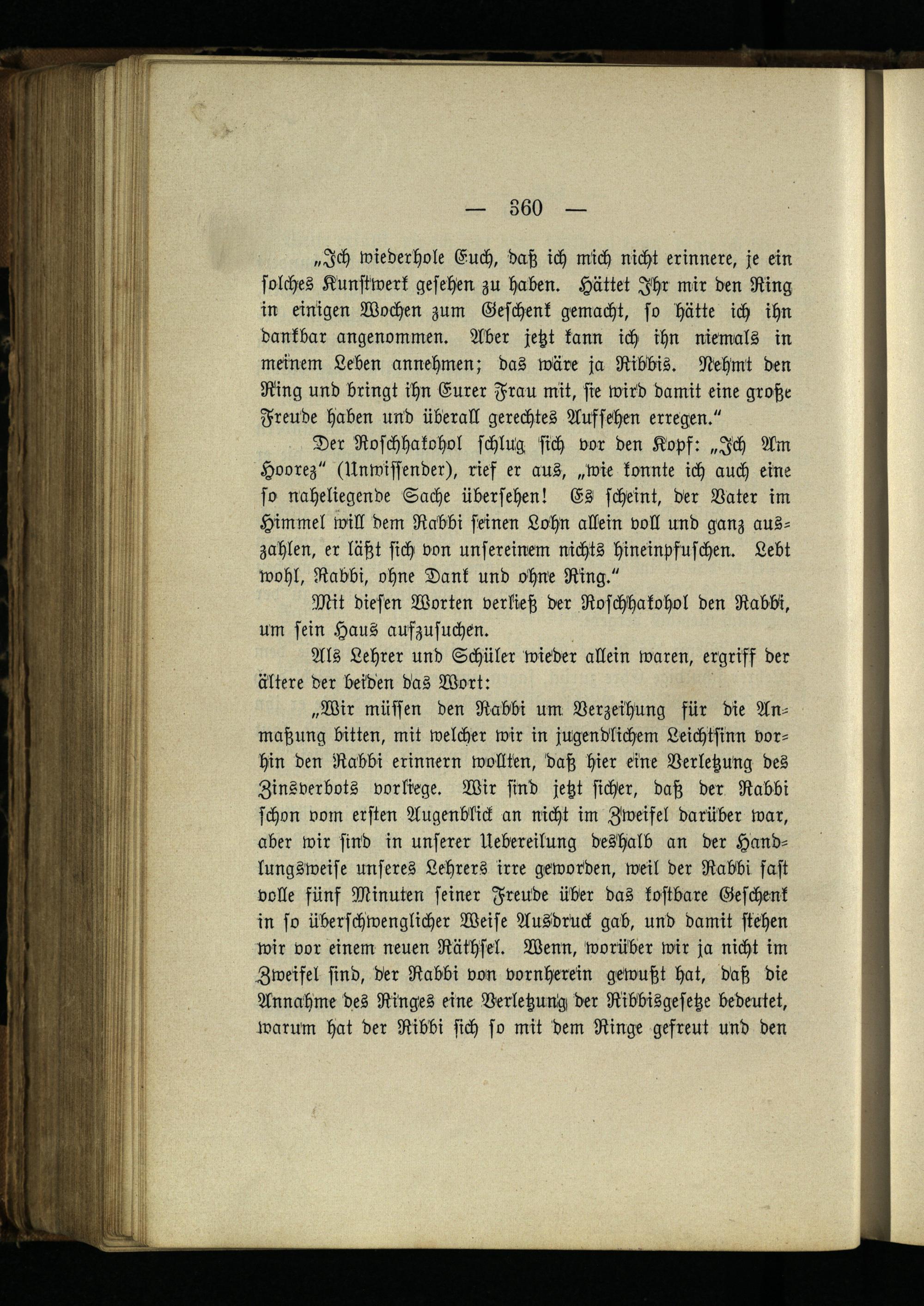 „Ich wiederhole Euch, daß ich mich nicht erinnere, je ein solches Kunstwerk gesehen zu haben. Hättet Ihr mir den Ring in einigen Wochen zum Geschenk gemacht, so hätte ich ihn dankbar angenommen. Aber jetzt kann ich ihn niemals in meinem Leben annehmen; das wäre ja Ribbis. Nehmt den Ring und bringt ihn Eurer Frau mit, sie wird damit eine große Freude haben und überall gerechtes Aufsehen erregen."