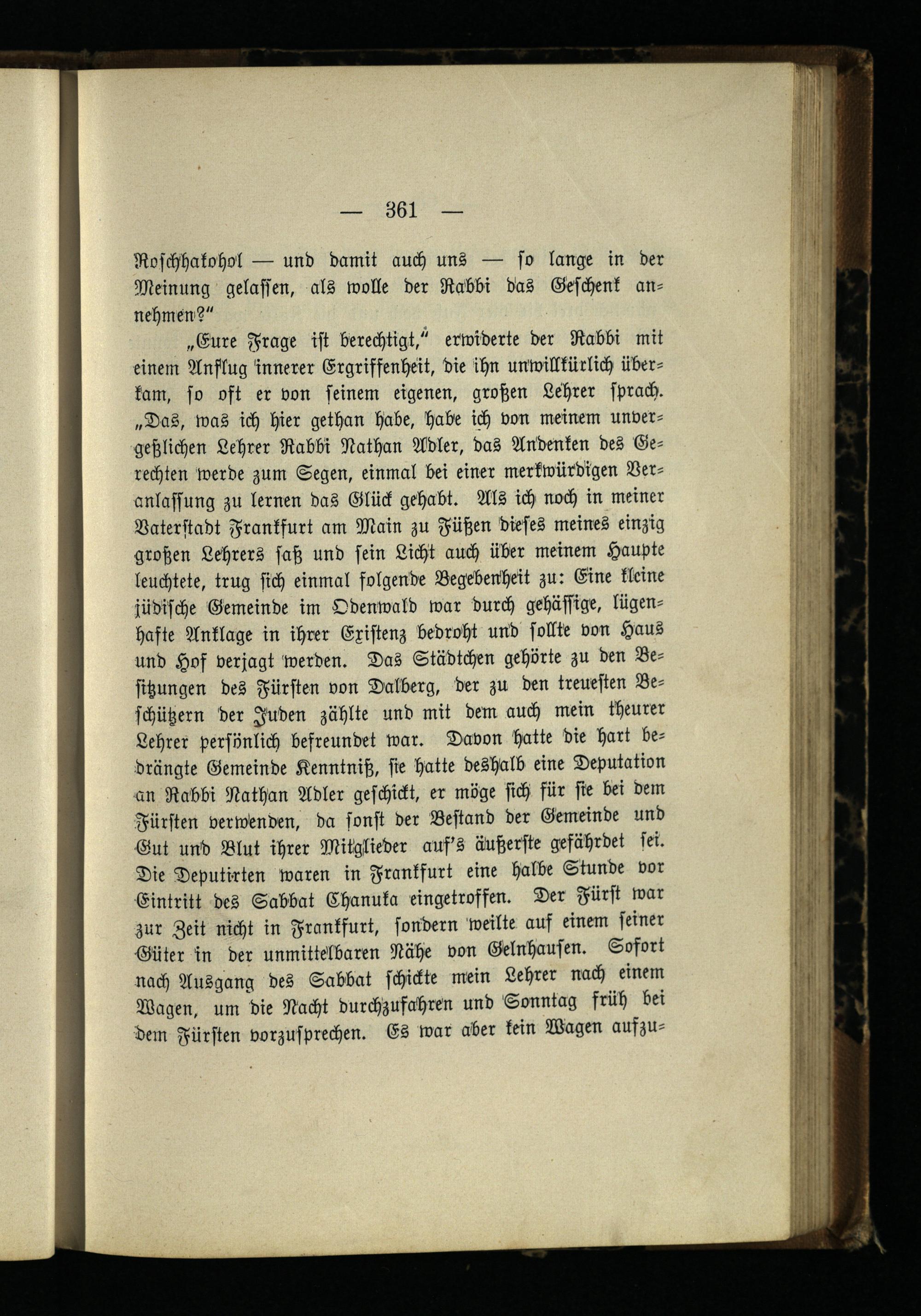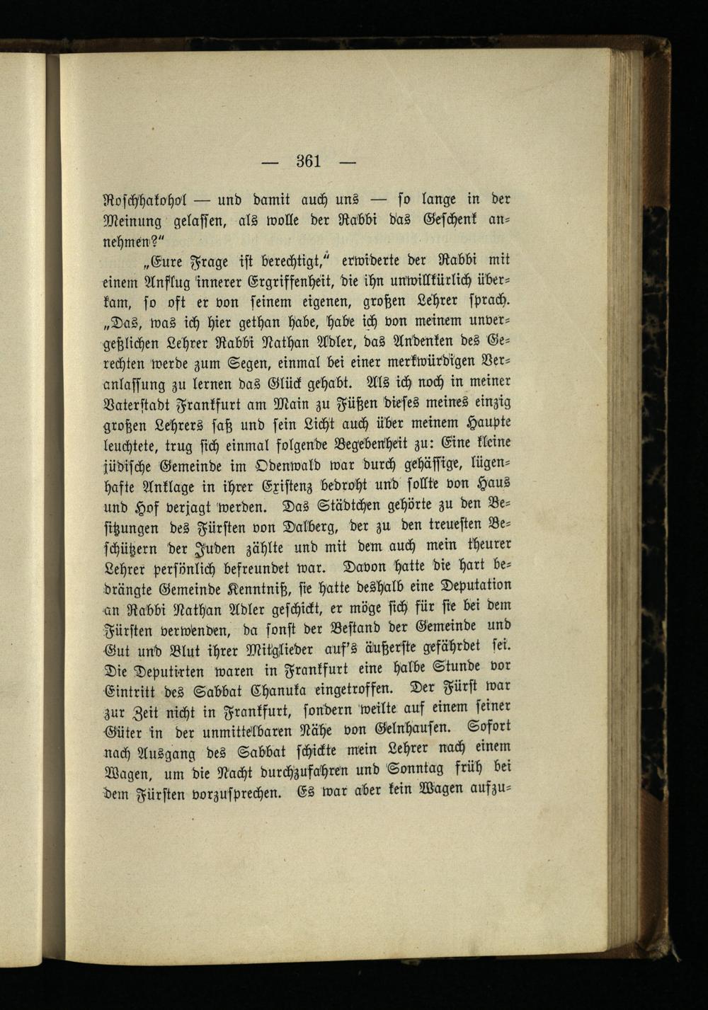 „Eure Frage ist berechtigt," erwiderte der Rabbi mit einem Anflug innerer Ergriffenheit, die ihn unwillkürlich überkam, so oft er von seinem eigenen, großen Lehrer sprach. „Das, was ich hier gethan habe, habe ich von meinem unvergeßlichen Lehrer Rabbi Nathan Adler , das Andenken des Gerechten werde zum Segen, einmal bei einer merkwürdigen Veranlassung zu lernen das Glück gehabt. Als ich noch in meiner Vaterstadt Frankfurt am Main zu Füßen dieses meines einzig großen Lehrers saß und sein Licht auch über meinem Haupte leuchtete, trug sich einmal folgende Begebenheit zu: Eine kleine jüdische Gemeinde im Odenwald war durch gehässige, lügenhafte Anklage in ihrer Existenz bedroht und sollte von Haus und Hof verjagt werden. Das Städtchen gehörte zu den Besitzungen des Fürsten von Dalberg, der zu den treuesten Beschützern der Juden zählte und mit dem auch mein theurer Lehrer persönlich befreundet war. Davon hatte die hart bedrängte Gemeinde Kenntniß, sie hatte deshalb eine Deputation an Rabbi Nathan Adler geschickt, er möge sich für sie bei dem Fürsten verwenden, da sonst der Bestand der Gemeinde und Gut und Blut ihrer Mitglieder auf's äußerste gefährdet sei. Die Deputi-rten waren in Frankfurt eine halbe Stunde vor Eintritt des Sabbat Chanuka eingetroffen. Der Fürst war zur Zeit nicht in Frankfurt , sondern weilte aus einem seiner Güter in der unmittelbaren Nähe von Gelnhausen . Sofort nach Ausgang des Sabbat schickte mein Lehrer nach einem Wagen, um die Nacht durchzufahren und Sonntag früh bei dem Fürsten vorzusprechen. Es war aber kein Wagen auszu-