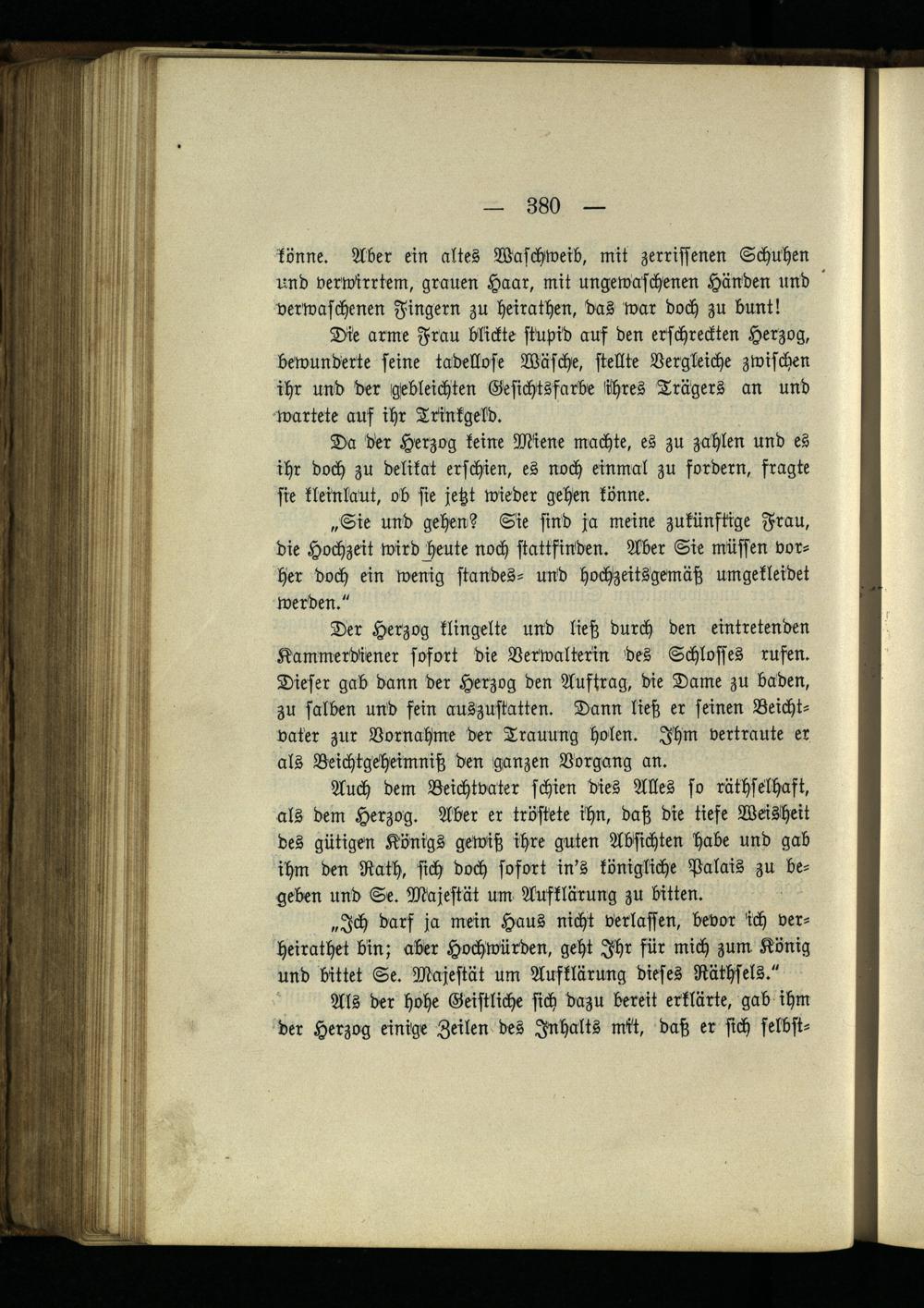 Der Herzog klingelte und ließ durch den eintretenden Kammerdiener sofort die Verwalterin des Schlosses rufen. Dieser gab dann der Herzog den Auftrag, die Dame zu baden, zu salben und fein auszustatten. Dann ließ er seinen Beichtvater zur Vornahme der Trauung holen. Ihm vertraute er als Beichtgeheimniß den 'ganzen Vorgang an.