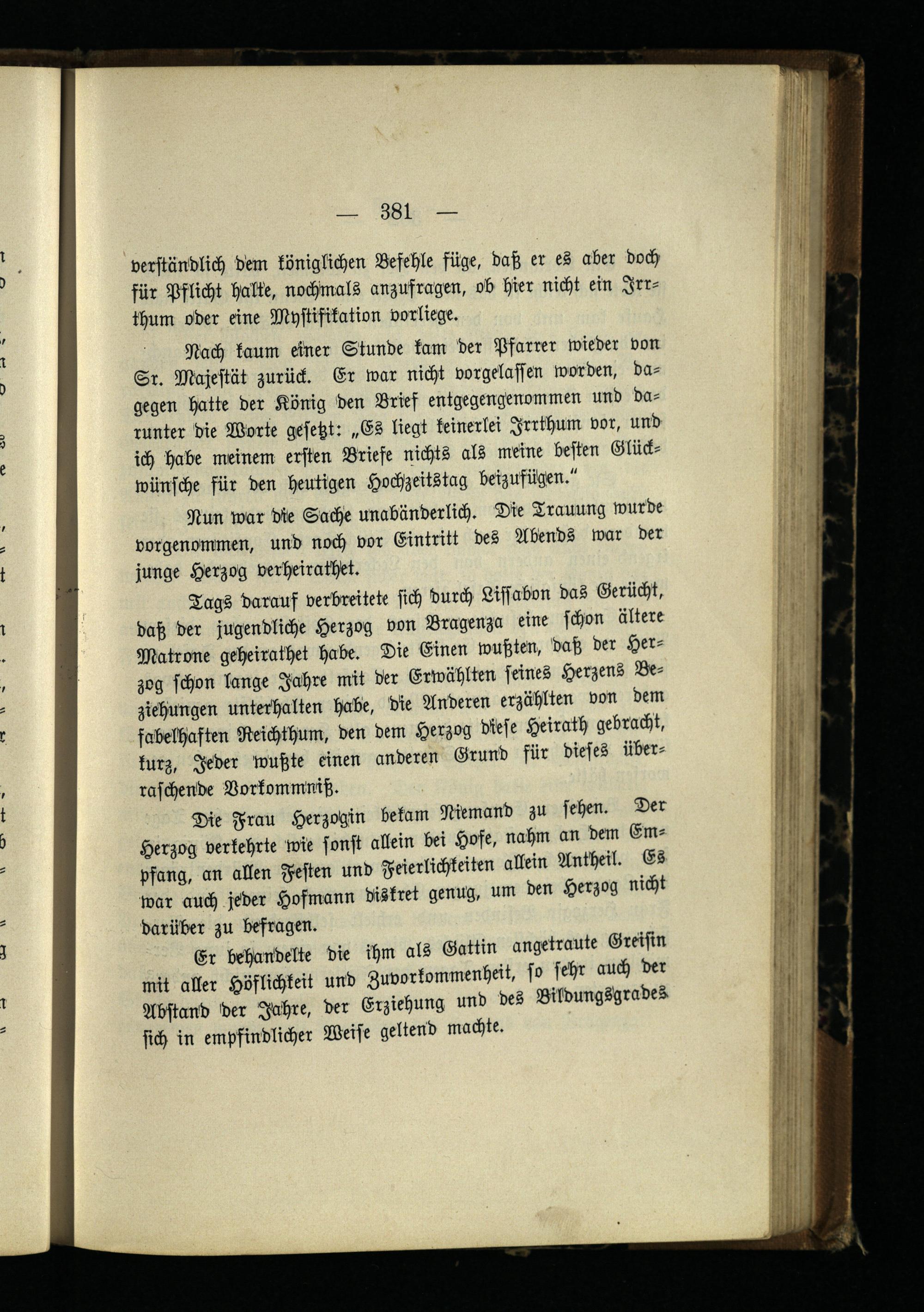 Tags darauf verbreitete sich durch Lissabon das Gerücht, daß der jugendliche Herzog von Bragenza eine schon ältere Matrone geheirathet habe. Die Einen wußten- daß der Herzog schon lange Jahre mit der Erwählten seines Herzens Beziehungen unterhalten habe, die Anderen erzählten von dem fabelhaften Reichthum, den dem Herzog diese Heirath gebracht, kurz, Jeder wußte einen anderen Grund für dieses überraschende VorkoinmNiß.