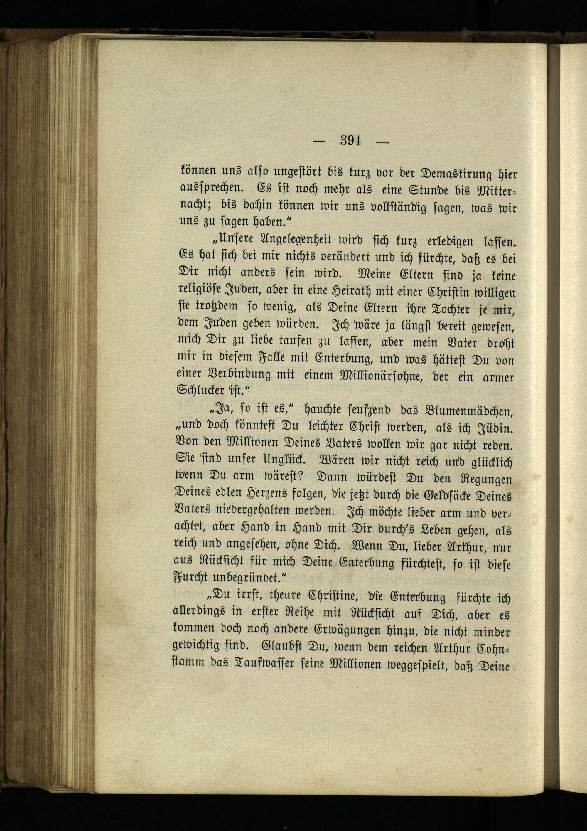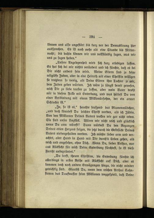 „Unsere Angelegenheit wird sich kurz erledigen lassen. Es hat sich bei mir nichts verändert und ich fürchte, daß es bei Dir nicht anders sein wird. Meine Eltern sind ja keine religiöse Inden, aber in eine Heirath mit einer Christin willigen sie trotzdem so wenig, als Deine Eltern ihre Tochter je mir, dem Inden geben würden. Ich wäre ja längst bereit gewesen, mich Dir zu liebe taufen zu lasten, aber mein Vater droht mir in diesem Falle mit Enterbung, und was hättest Du von einer Verbindung mit einem Millionärsohne, der ein armer Schlucker ist."
