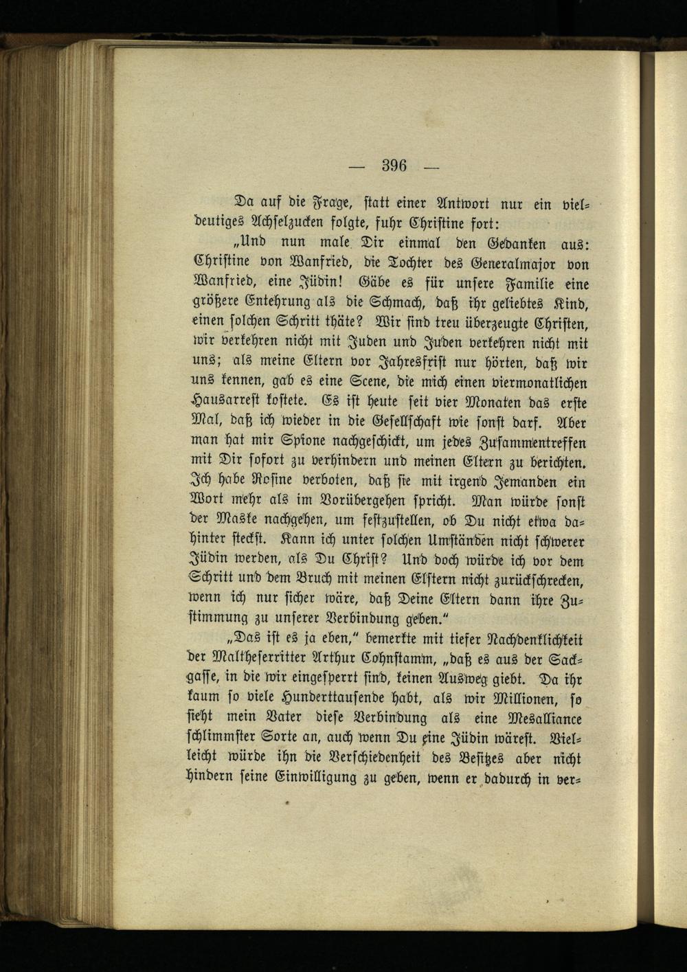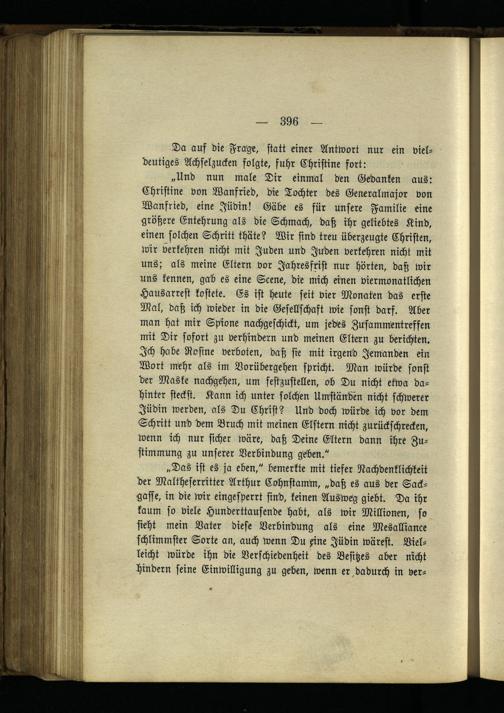 „Und nun male Dir einmal den Gedanken aus: Christine von Wanfried, die Tochter des Generalmajor von Wanfried , eine Jüdin! Gäbe es für unsere Familie eine größere Entehrung als die Schmach, daß ihr geliebtes Kind, «inen solchen Schritt thäte? Wir sind treu überzeugte Christen, wir Verkehren nicht mit Juden und Juden verkehren nicht mit uns; als meine Eltern vor Jahresfrist nur hörten, daß wir uns kennen, gab es eine Scene, die mich einen viermonatlichen Hausarrest kostete. Es ist heute seit vier Monaten das erste Mal, daß ich wieder in die Gesellschaft wie sonst darf. Aber man hat mir Spione nachgeschickt, um jedes Zusammentreffen mit Dir sofort zu verhindern und meinen Eltern zu berichten. Ich habe Rosine verboten, daß sie mit irgend Jemanden ein Wort mehr als im Vorübergehen spricht. Man würde sonst der Maske nachgehen, um sestzustellen, ob Du nicht etwa dahinter steckst. Kann ich unter solchen Umständen nicht schwerer Jüdin werden, als Du Christ? Und doch würde ich vor dem Schritt und dem Bruch mit meinen Elstern nicht zurückschrecken, wenn ich nur sicher wäre, daß Deine Eltern dann ihre Zustimmung zu unserer Verbindung geben."