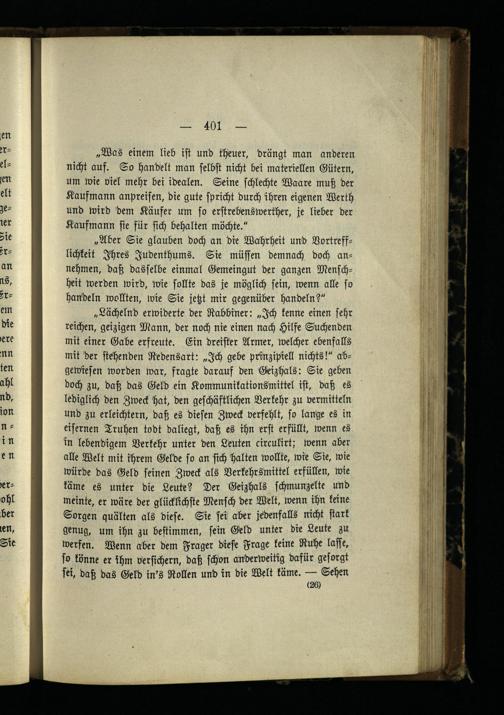 „Lächelnd erwiderte der Rabbiner: „Ich kenne einen sehr reichen, geizigen Mann, der noch nie einen nach Hilfe Suchenden mit einer Gäbe erfreute. Ein dreister Armer, welcher ebenfalls mit der sichenden Redensart: „Ich gebe prinzipiell nichts!" abgewiesen worden war, fragte darauf den Geizhals: Sie geben doch zu, daß das Geld ein Kommunikationsmittel ist, daß es lediglich den Zweck hat, den geschäftlichen Verkehr zu vermitteln und zu erleichtern, daß es diesen Zweck verfehlt, so lange es in eisernen Truhen todt daliegt, daß es ihn erst erfüllt, wenn es in lebendigem Verkehr unter den Leuten circulirt; wenn aber alle Welt mit ihrem Gelde so an sich halten wollte, wie Sie, wie würde das Geld seinen Zweck als Verkehrsmittel erfüllen, wie käme es unter die Leute? Der Geizhals schmunzelte und meinte, er wäre der glücklichste Mensch der Welt, wenn ihn keine Sorgen quälten als diese. Sie sei aber jedenfalls nicht stark genug, um ihn zu bestimmen, sein Geld unter die Leute zu werfen. Wenn aber dem Frager diese Frage keine Ruhe lasse, so könne er ihm versichern, daß schon anderweitig dafür gesorgt sei. daß das Geld in's Rollen und in die Welt käme. — Sehen